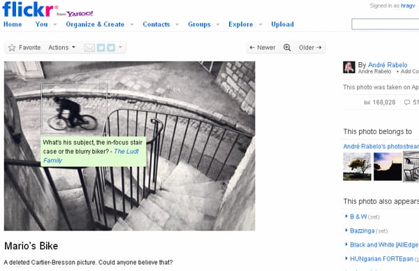 I asked to interview Hawk at the time about this curious photo group but he never replied — I assume he wasn’t interested. I was curious what insight his online group gave us about the evolving aesthetics and taste of online communities. And now, I discovered (via Kotke) that André Rabelo may have had the same idea and launched his own experiment a while back by posting an iconic image by Henri Cartier-Bresson, a masterpiece of modern photography.
