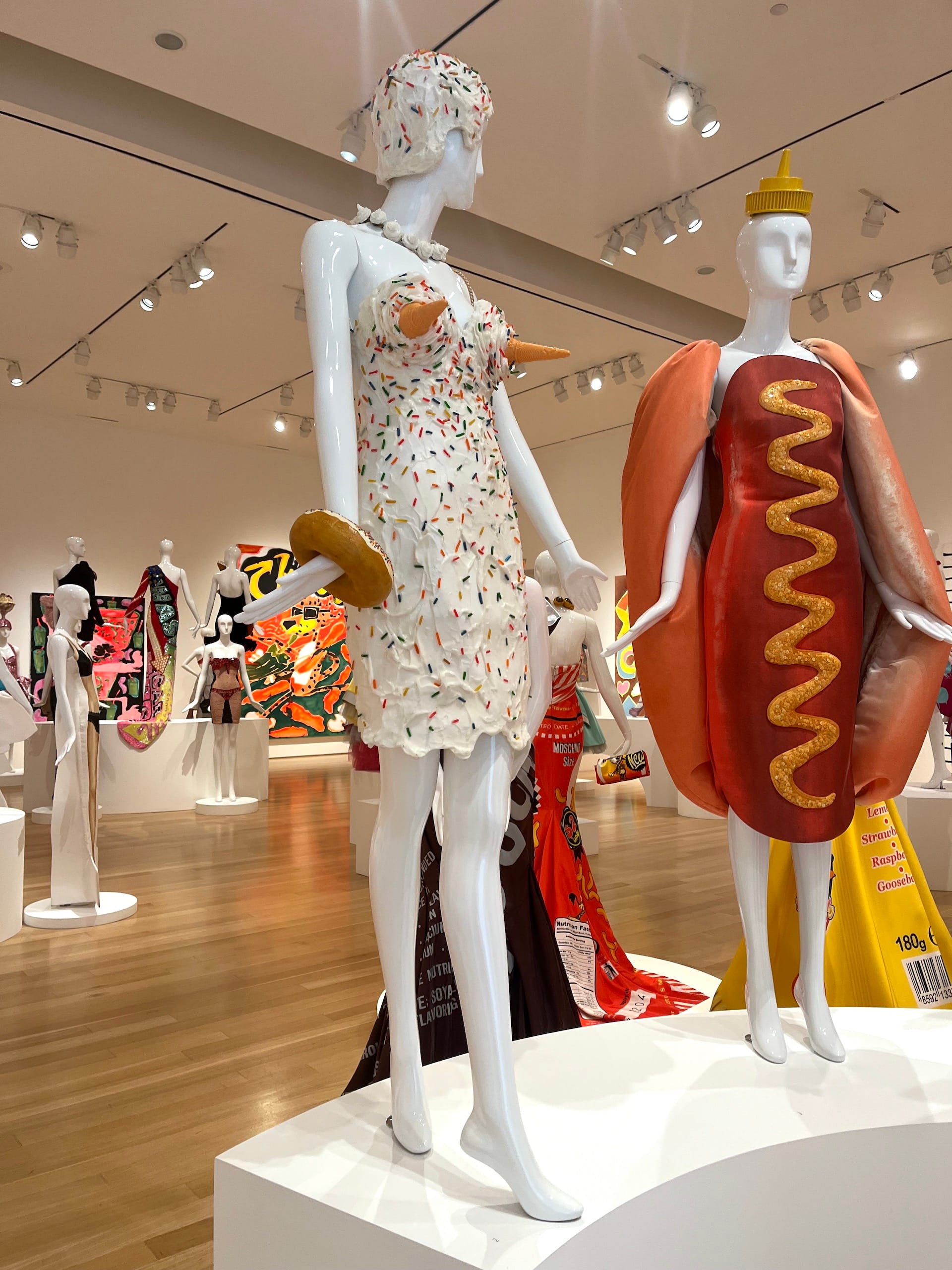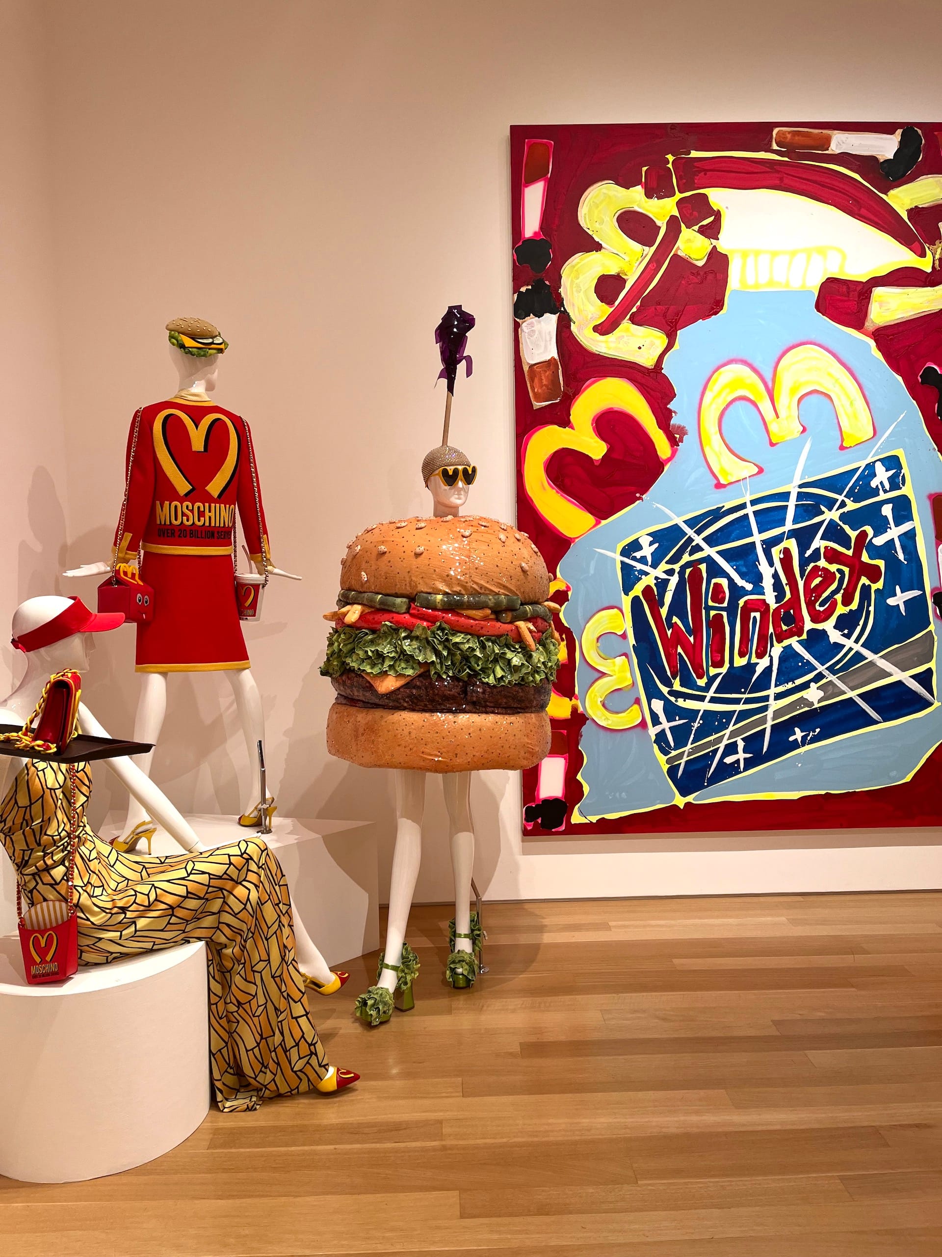 After Bernhardt’s paintings were installed, Scott spent several days in the gallery with her work before showing up with 30 years’ worth of fashion (10 spent helming the luxury label Moschino). Up to three mannequins might cluster around the paintings then spill out into the middle of the galleries. Some of the juxtapositions are straightforward, such as a dress with a Hershey Kiss motif with a painting of the chocolates. Scott’s outrageous hamburger dress, famously worn by Katy Perry at the 2019 Met Gala afterparty, is side by side with Bernhardt’s painting of McDonald’s golden arches. The confection puzzle comes together quite nicely.