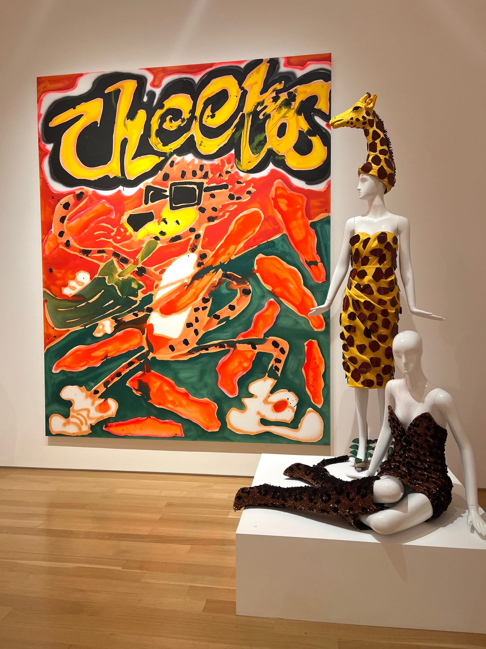 Northrup left much of the show’s layout to the artists; she wanted to promote their shared aesthetics with a certain amount of freedom. Bernhardt’s massive paintings, hung before the garments arrived, fill four galleries, taking up most of the wall space. Her brightly colored, thinned-out acrylics, drips and all, articulate a stream-of-consciousness coupling of seemingly unrelated objects. Cartoonish renderings of a Windex bottle and cigarettes, Cheetos and the Pink Panther, Diet Coke and mushrooms all float in space.