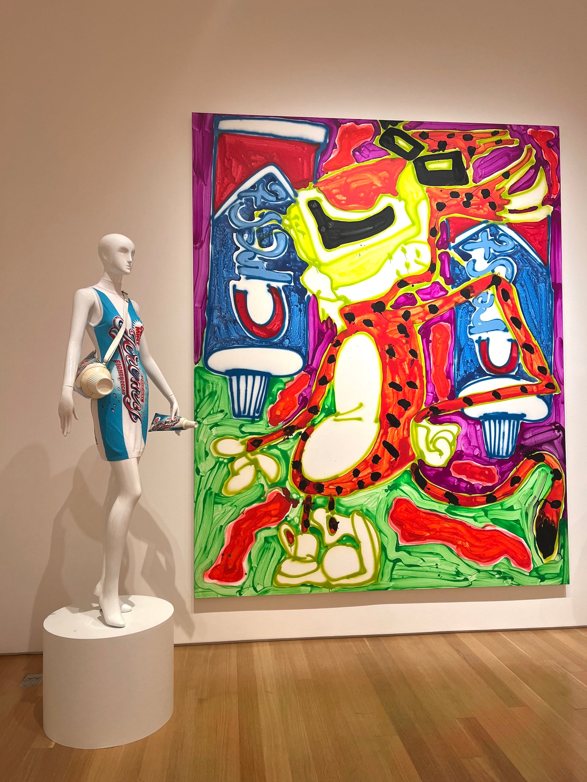 A Match Made in Heaven includes nearly 40 large-scale paintings by Bernhardt and more than 500 designs by Scott — 200 of which are sneakers he created for Adidas. The visual cacophony of bright neon colors, kitsch, textures, and pop iconography borders on ocular assault — let maximalism sing out! But somehow this playful combination works brilliantly. When I visited, museum-goers were weaving their way through a maze of Scott’s eclectic mix of outfits and dresses, marveling at all the detail. Some were giggling at the obvious pairing — who can resist an oversized, caramel-colored, prescription bottle-shaped purse placed next to a painting of Xanax pills?