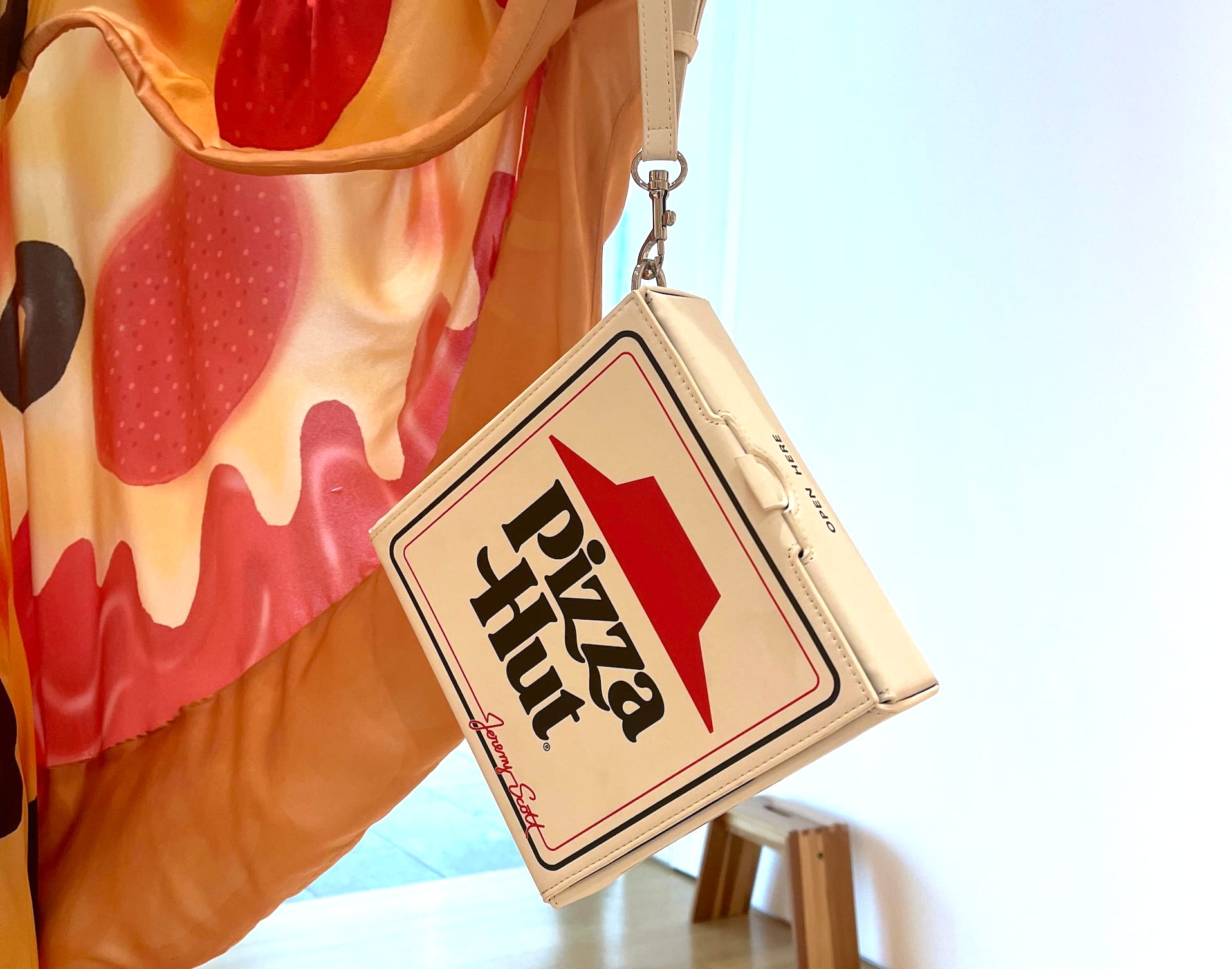 Scott’s zany, over-the-top designs employ pop iconography with a focus on American consumerism, in harmony with Bernhardt’s imagery. Both artists dig into this theme with depictions of junk food: Cheetos, hamburgers, French fries, candy bars. Scott’s droll genius is especially clear in the attention to detail seen in his accessories: a vinyl pizza box is a purse; a mustard squeeze-bottle cap is a hat; lettuce leaves add texture to shoes.