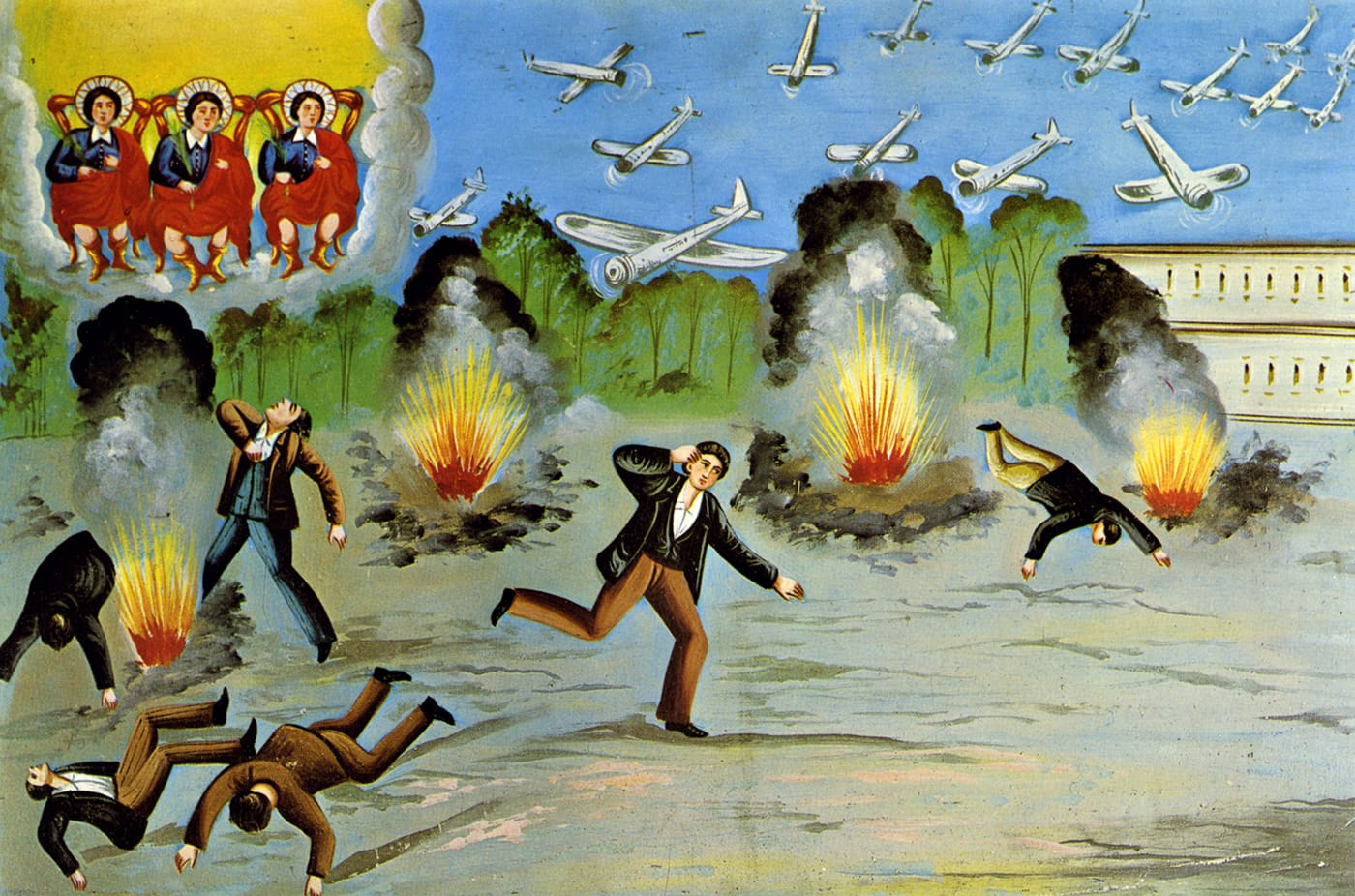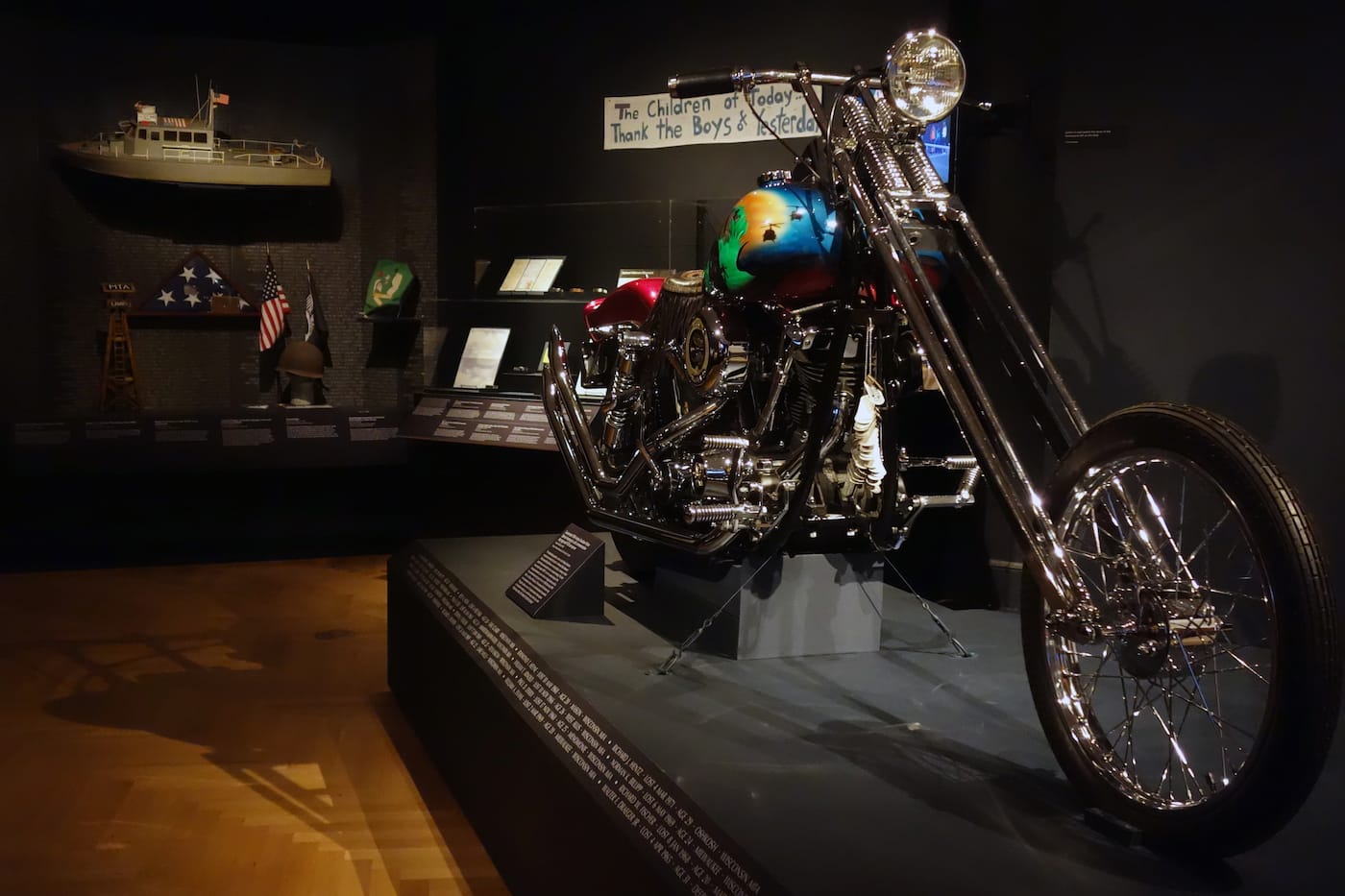 Organized by Weinryb with Chief Curator Marianne Lamonaca and Associate Curator Caroline Hannah, Agents of Faith thoughtfully gives attention to diverse parts of the globe. Only the Vietnam Veterans Memorial gets its own floor, dominated by a 1994 Harley Davidson Police Special motorcycle presented at the wall in 1995. In this pensive experience, there is something missing of the overwhelming emotional sensation of visiting a shrine; wall-sized photographs, such as one of amassed wooden hands dangling in a Brazilian convent, only hint at the power of being in places where so many people have expressed their most private hopes and gratitudes. Nevertheless, the exhibition does encourage time with each piece to consider its origin story. Both a 1951 Italian wooden donkey leg tied with a silk ribbon and a photograph of the healed animal, and a 19th-century Kongo kingdom power figure riddled with nails recalling individual vows, have moving reflections of universal hope and faith. An ex-voto painting of a 1944 aerial bombing in Sicily has three saints emerging from the heavens to protect its patron, the vivid depiction of war wordlessly communicating a relief at salvation.