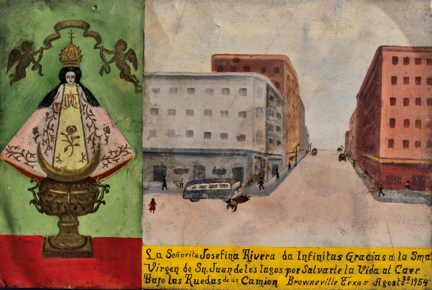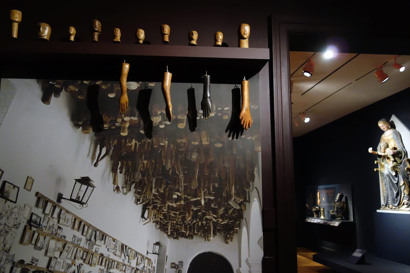 Agents of Faith is not chronological, so visitors can start with the 14th-century Italian “Enthroned Virgin and Child,” which X-rays revealed contains traces of lace and a rosary left beneath the Madonna’s canvas clothes, or Yoko Ono’s “Wish Tree” (the series where visitors can tie wishes on branches has been ongoing since the 1980s, so it’s maybe a little overplayed, but engagement is important for an exhibition so much about interaction). There are thematic sections, like on the process of creating wax votive objects, and a whole case of heads, suggesting a deep human history of aches and mental maladies. Walls of ex-voto paintings are transfixing with their woeful narratives, from bloody surgical scenes to shipwrecks, all of which the devotees survived. A collection of retabalos created by Mexican migrant workers represent the harrowing dangers of the US border.