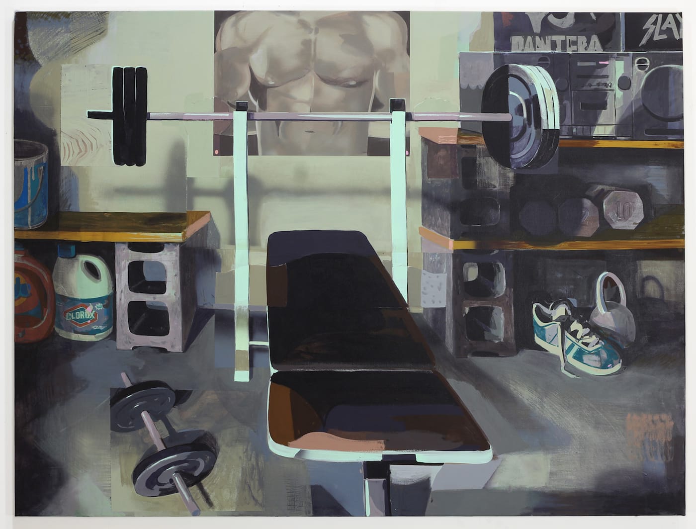 Bollinger’s palette brought to mind an unlikely association with the great painter, Edwin Dickinson, particularly his painting “Francis Foley” (1927), with its sickly greens and pale violets. In addition to using similar colors, Bollinger adds the dusty pinks and neon pinks of Post-it notes to his tonalist pallet. In “Carolyn’s Office” (2017), done in Flashe and acrylic, Bollinger depicts Post-it notes in pink, yellow, blue, and white throughout the gray, green, and brown painting, animating the drab colors. There are four disembodied hands on the desk. One is holding a phone, one is jotting something on a Post-it, one is holding what looks like a receipt, while the fourth holds another pink Post-it. A spreadsheet glows on the computer screen. Whatever the job, it requires multiple hands and the worker’s compliance.