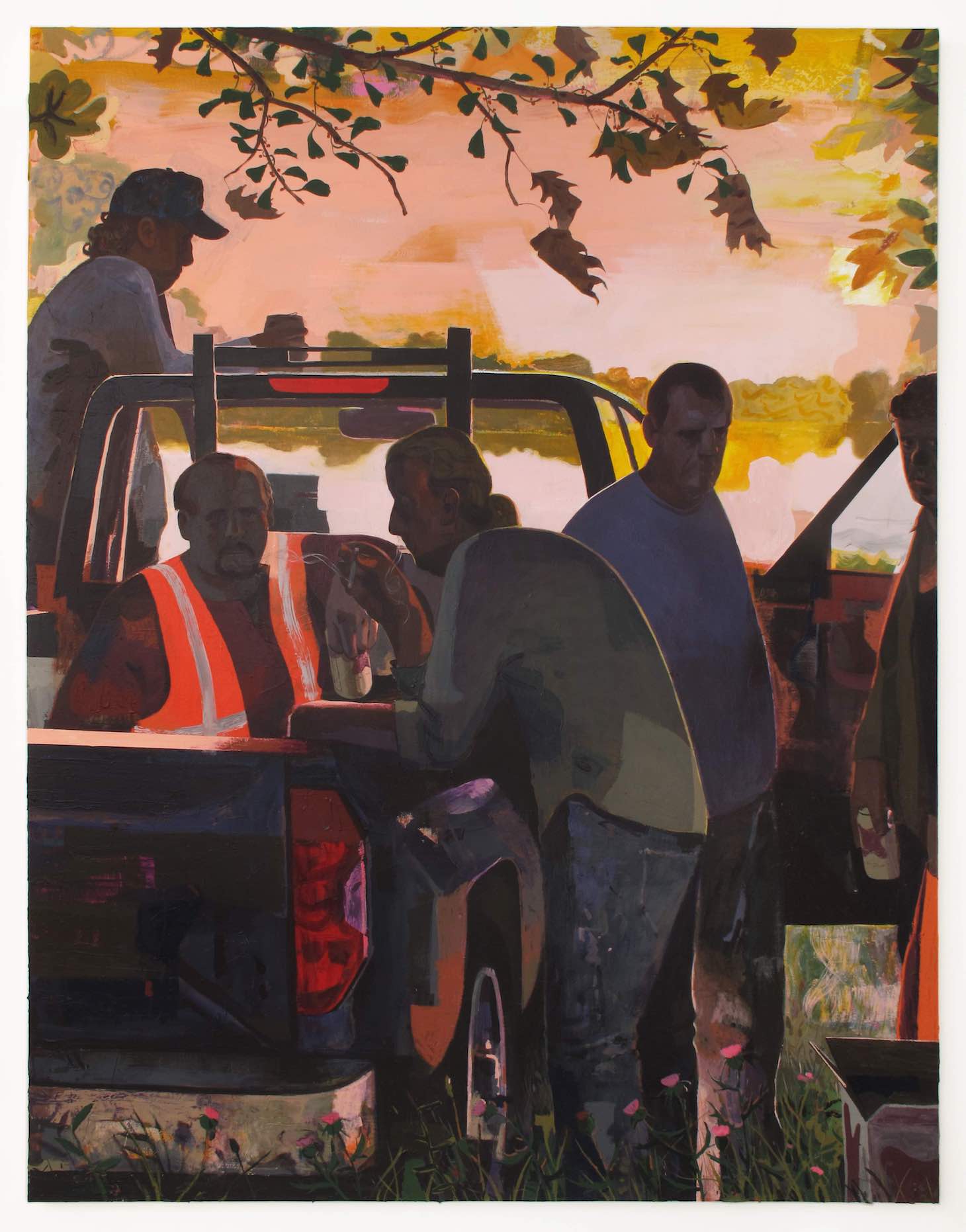 In “Furlough 1” (2021), five men are gathered around the back of a pickup truck, which seems to be facing a lake. The pink and yellow light suggests that it is late afternoon. The man sitting in the bed of the truck wears an orange safety vest. He is drinking a beer and staring back at us, with an expression that could be frustrated, despondent, or exhausted. A man just to his right rests one arm on the truck bed, while smoking a cigarette.