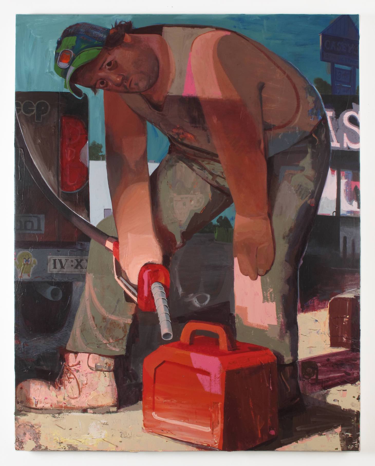 In “One Gallon” (2021), a large, thick-limbed man in dirty pants and a sleeveless shirt is bent over, pumping gasoline into a one-gallon red can. To the left of him, cropped by the painting’s edge, is part of a pickup truck’s tailgate.