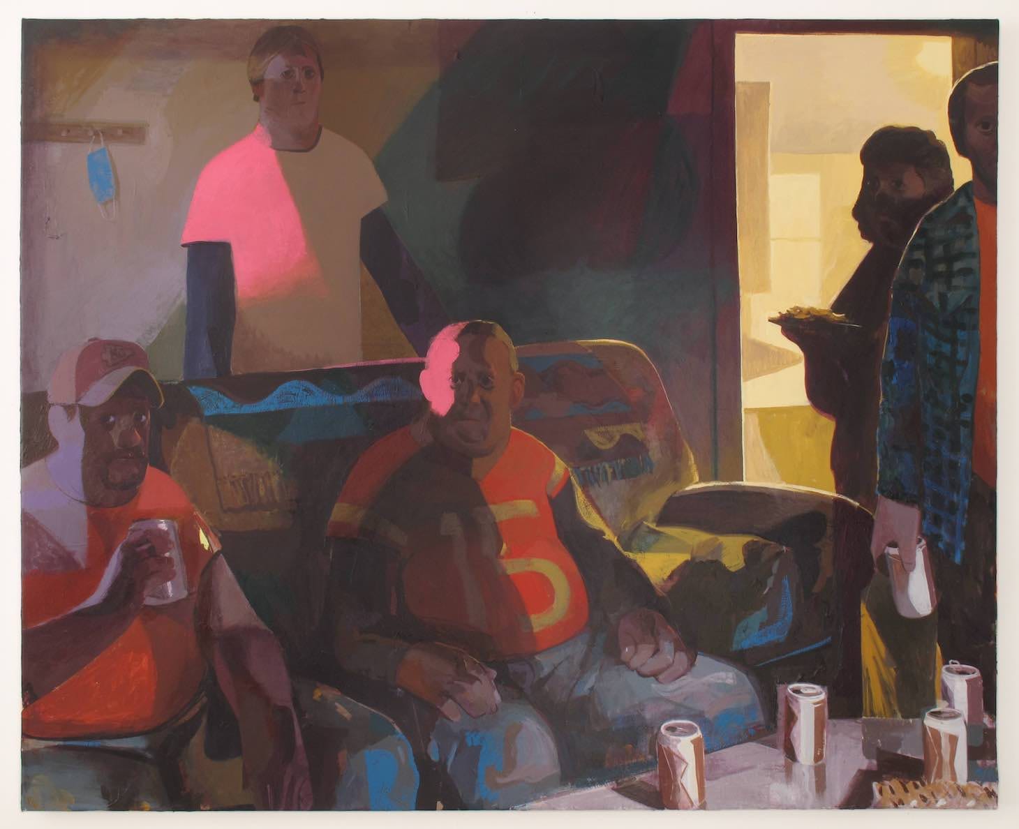 Look at the men gathered on or around a couch in “Super Bowl Sunday” (2021). Four open beer cans are on the coffee table. The pot-bellied man sitting in the middle of the couch wears a short-sleeved red sports jersey bearing the number 15 in yellow on its front; a man sitting on his left wears a plain red t-shirt.
