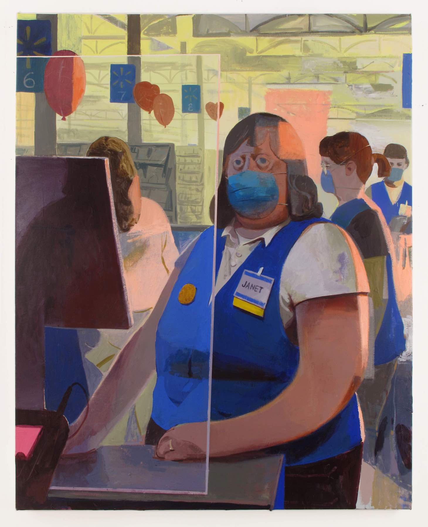 In the painting “Magic Hour” (2021), an overweight Walmart cashier wearing a blue face mask and a sleeveless blue uniform bears an oversized name tag that reads “Janet.” Standing behind the protective Plexiglas barrier, she is staring blankly, either at the cash register’s computer screen or past us, as if we are not there. The absence of human communication is true of the three other women behind Janet, two of whom are cashiers. No one is talking.