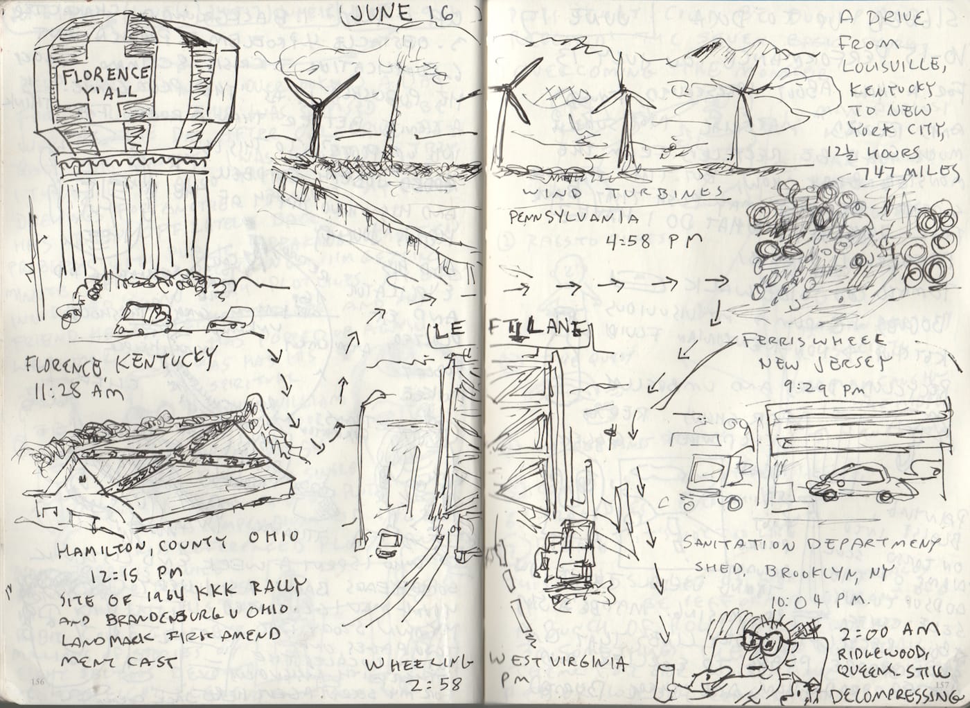 Last month Jude Tallichet and I and our dogs Fleurry and Jeffrey drove from Jude’s parents’ house in Louisville, Kentucky, to our home in Ridgewood, Queens, reversing the direction of the drive we made six days before. We make this car trip twice a year, once in the summer and once in the winter. It’s a long day, but can be handled in three or four driving shifts with time out for dog walks and occasional stops to look around. Six states are involved: New York, New Jersey, Pennsylvania, West Virginia, Ohio and Kentucky. What we always remember are the endless mountains and tunnels of Pennsylvania, the strange bridge passage through Wheeling, West Virginia, and the flatness of Ohio. Depending on the direction we are going, it will be bright and empty early on in Kentucky and dark and frantic in the eastern states at the end of the drive, or the morning traffic will be slow and congested in the east and it will be dark and wet late at night in Cincinnati and Kentucky. There isn’t a single dramatic moment when the red states shift to purple and then to blue or vice versa. Maybe the closest happens just west of the New Jersey state line in Pennsylvania when you become aware of the buildup of fracking equipment, trucks, pipes and storage tanks in the turnoffs and fields running parallel to the highway. We like to stop at Big Bone Lick State Park, the Birthplace of Extinction, but we haven’t had a chance to visit the Creation Museum or Noah’s Ark or Roadside America, The World’s Greatest Indoor Miniature Village. Someday we hope we will, though.