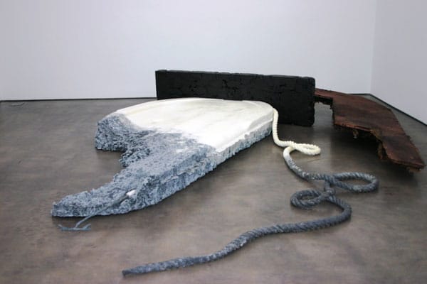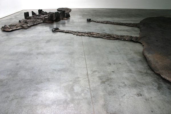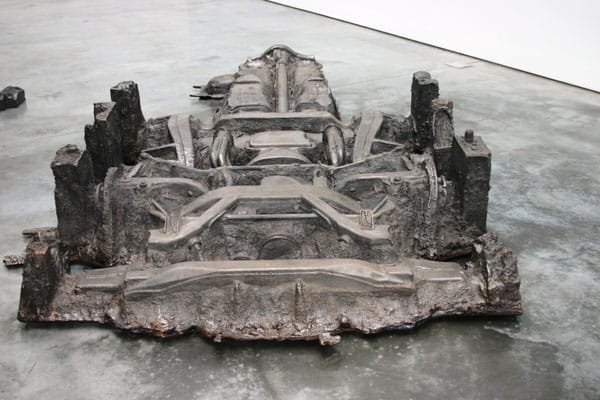 Matthew Barney’s most recent exhibition Djed opened at Gladstone Gallery on September 17. Like everything the artist tends to do, the sculptures on view are of epic proportion. The objects themselves are extremely minimal steel and graphite molded constructions that are half early Richard Serra and half alien crash site. Despite the simplicity and stark visual effect of the gallery space there is a conceptual undertone to these sculptures that would make a baroque palace feel Quaker in comparison. Again, like most of Barney’s work the work installed in the gallery the product of a ritualized daylong event last year in Detroit. Khu was merely one act of Barney’s site specific opera Ancient Evenings, based on Norman Mailer’s novel of the same name. New York Magazine critic Jerry Saltz recently published this review of the show. He missed the performance but recounts hearing “It also rained apocalyptically that day, and Barney’s performance included a freezing barge ride down the Detroit River, where the audience witnessed, among other things, a crane dredging up a 1967 Chrysler Imperial. There was also actress-athlete Aimee Mullins as Egyptian goddess Isis seated semi-naked on an engine block filled with live, writhing snakes.”