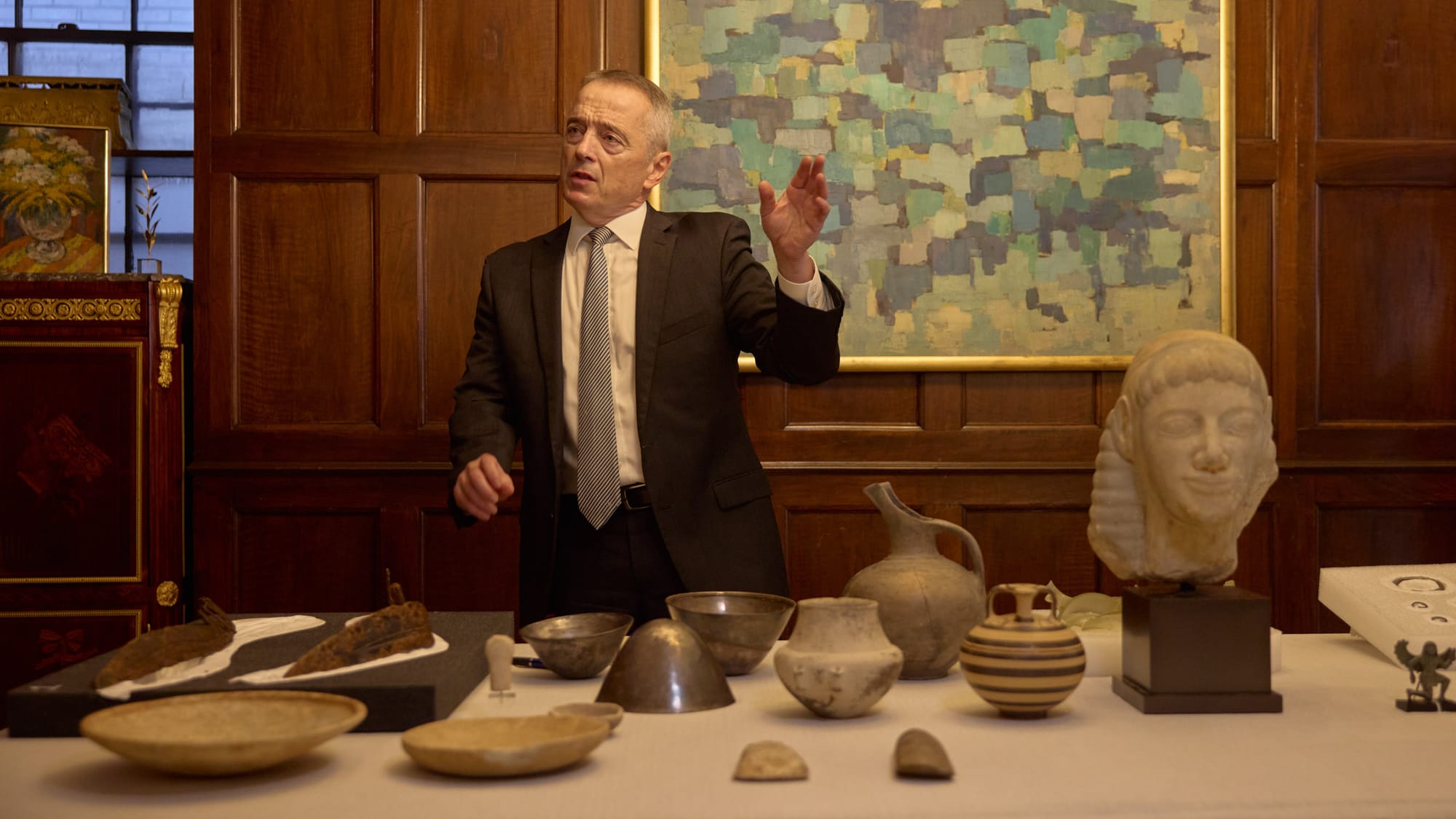Since returning to the Manhattan District Attorney’s Office in 2010, his unit has recovered more than 6,100 antiquities, totaling more than $480 million, stolen from Greece, Italy, Egypt, Iraq, Syria, Lebanon, Jordan, Israel, India, Pakistan, Afghanistan, Cambodia, Nepal, Thailand, and beyond. Bogdanos’s advocacy has influenced international policy, including UN Security Council Resolution 2199, which recognized antiquities trafficking as a source of terrorist funding. He maintains his mission to combat the illicit trade that threatens both cultural heritage and global security.