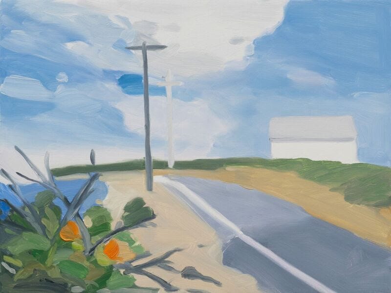 Then there is that barn. Gallace has painted it and a nearby telephone pole with a brilliant, glowing white that seems to have gathered and absorbed clouds and sea spray. While physical, they seem ethereal, made not of wood but of concentrated mist. Frankly gorgeous and even sublime, both barn and telephone pole are also unsettling, but in a way you can’t quite pin down.