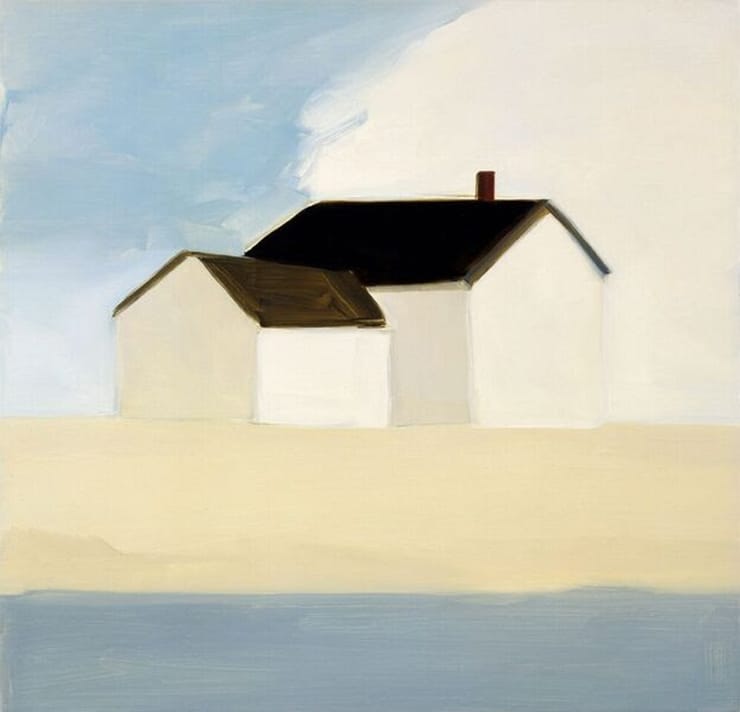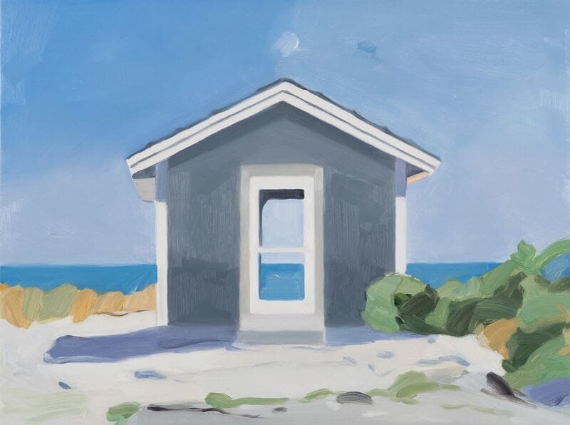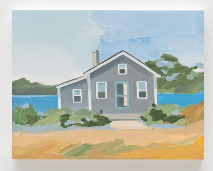 While her paintings are realistic, they display a pared down, at times rudimentary realism that also includes numerous abstract elements. Beach vegetation appears as just a few green and yellow-green brushstrokes. The ocean can be nothing more than a slightly askew blue band. Trees can be delineated just by gray, black, and white streaks. Houses — often without windows and doors — can consist of simple monochromatic planes.