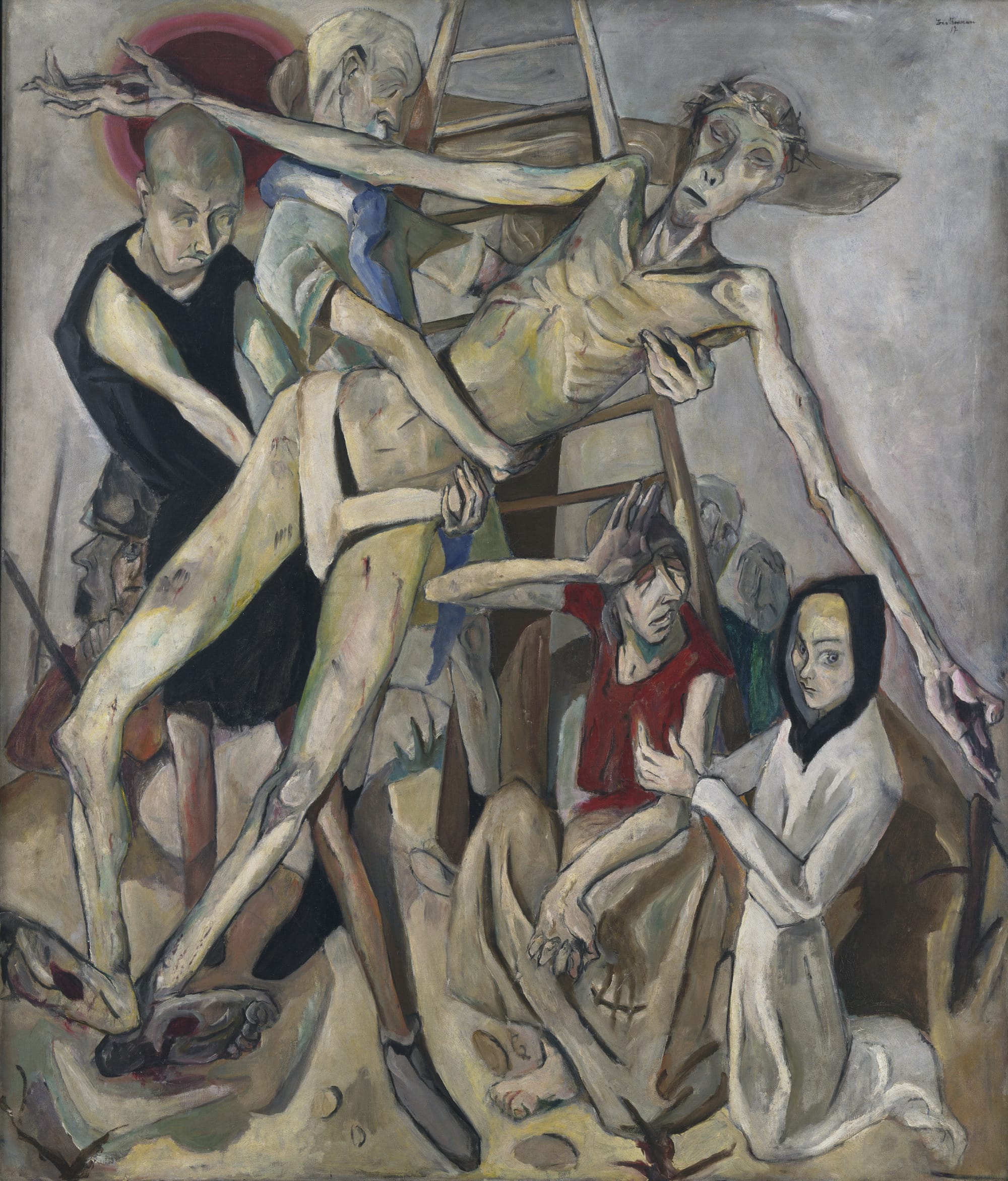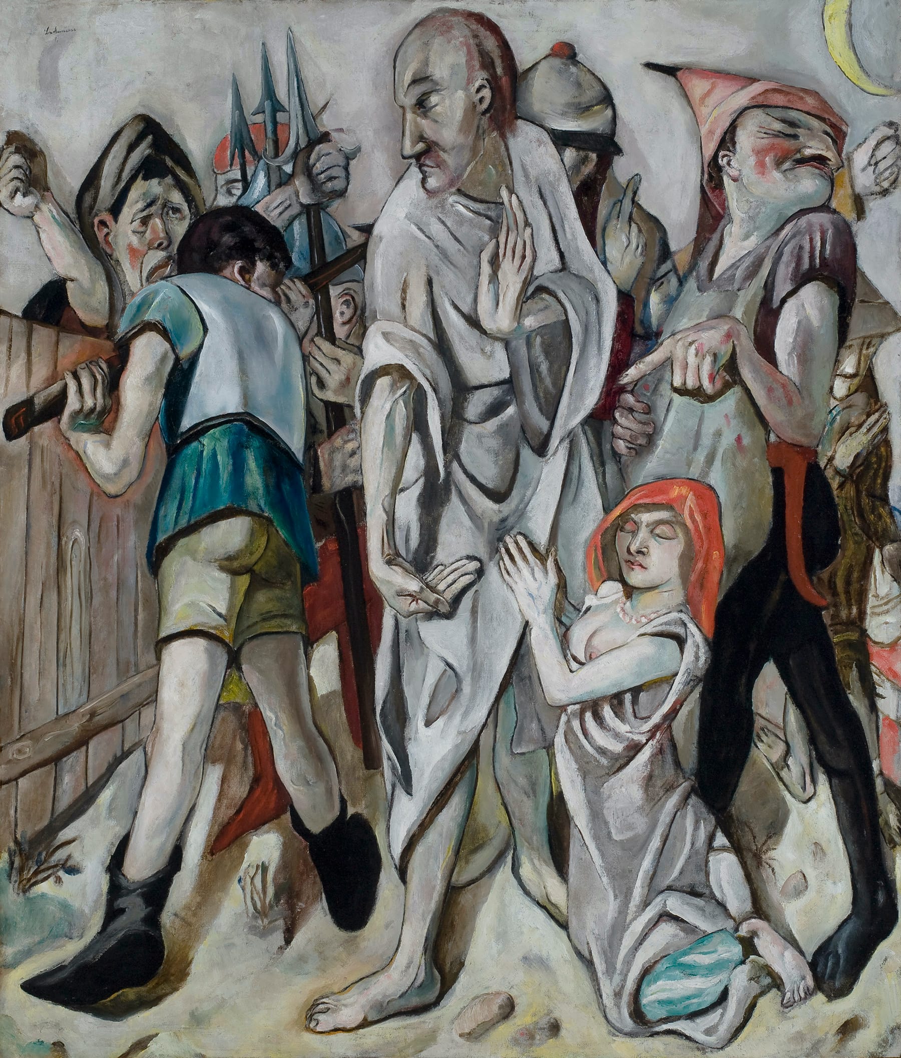 The adjacent wall presents three biblical paintings, all from 1917 — the great “Descent from the Cross” from the collection of the Museum of Modern Art; “Adam and Eve”; and “Christ and the Sinner,” one of three paintings borrowed from the rich Beckmann holdings at the Saint Louis Museum of Art. With their caricatured figures and leached-out color, these paintings mark a decisive break from Beckmann’s malerisch pre-war Post-Impressionism. But more tellingly, his Neo-Gothic impulse (according to “Transcendental Objectivity: Max Beckmann’s Modernity,” the illuminating catalogue essay by the exhibition’s curator, Olaf Peters) arose from a nationalistic desire, partially provoked by the war, to invest his work with a distinct “German-ness” — however uncomfortable that term may sound in light of events two decades later.