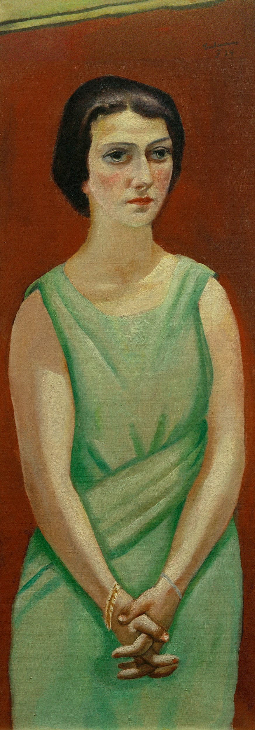 A suite of intimate canvases — portraits of his wife and his friends, a female nude, and a couple of still lifes — hang in a room alongside Beckmann’s ultra-sardonic “Paris Society,” a picture filled with grinning, bored, and thuggish specimens of the upper crust, which he first painted in 1925 and reworked twice, in 1931 and 1947. We can only imagine how his frame of mind evolved over the course of those tortuous decades. But we can tell at a glance the esteem in which Beckmann held his friends and loved ones. Perhaps the most beautiful painting I’ve ever seen by the artist is his portrait of Elsbet Götz (1924), a tender, light-filled image of a dark-haired woman in an iridescent green dress, her hands clasped before her. But history is a monster, and her fate, curtly recounted in a wall text, feels like a kidney punch.