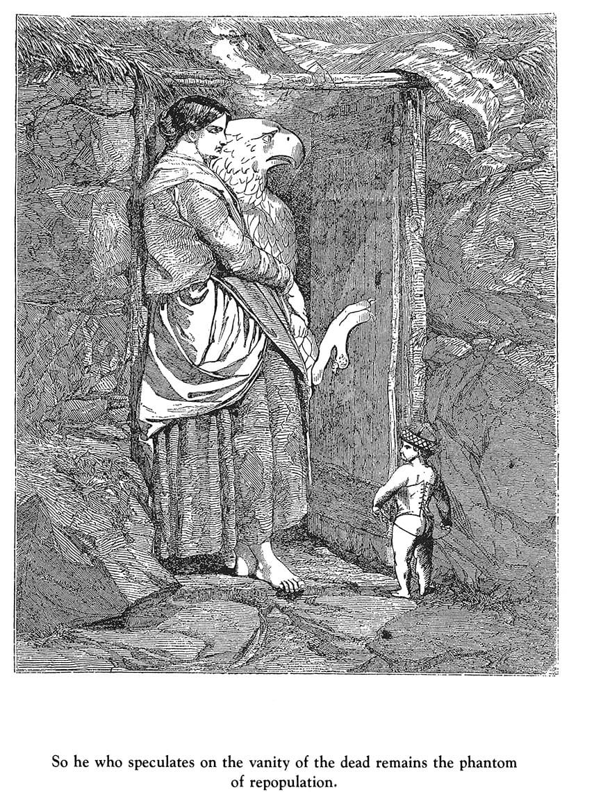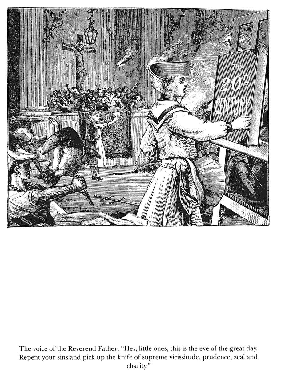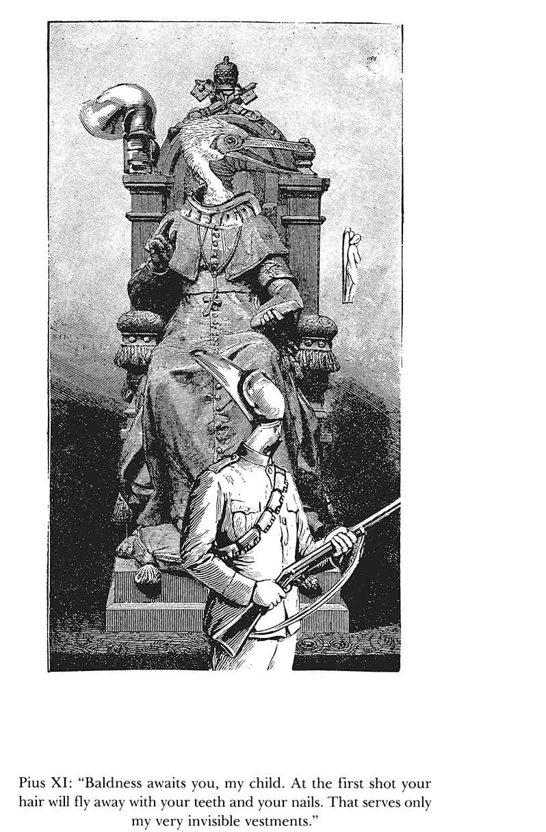 By no coincidence, birds and birdmen proliferate in all three books: a bird-headed pope prophesies doom in A Little Girl Dreams of Taking the Veil (“Baldness awaits you, my child … ”); a man-sized eagle “speculates on the vanity of the dead” in The Hundred Headless Woman; in A Week of Kindness, rooster men run amok, desecrating tombs; exult over victims in puddles of gore; hang themselves from four-poster beds. Ernst’s alter ego, “Loplop, Superior of the Birds,” was a mysterious birdman, poetic and portentous. In The Hundred Headless Woman, he plays a supporting role to the titular deity, a plenipotentiary from an avian planet.