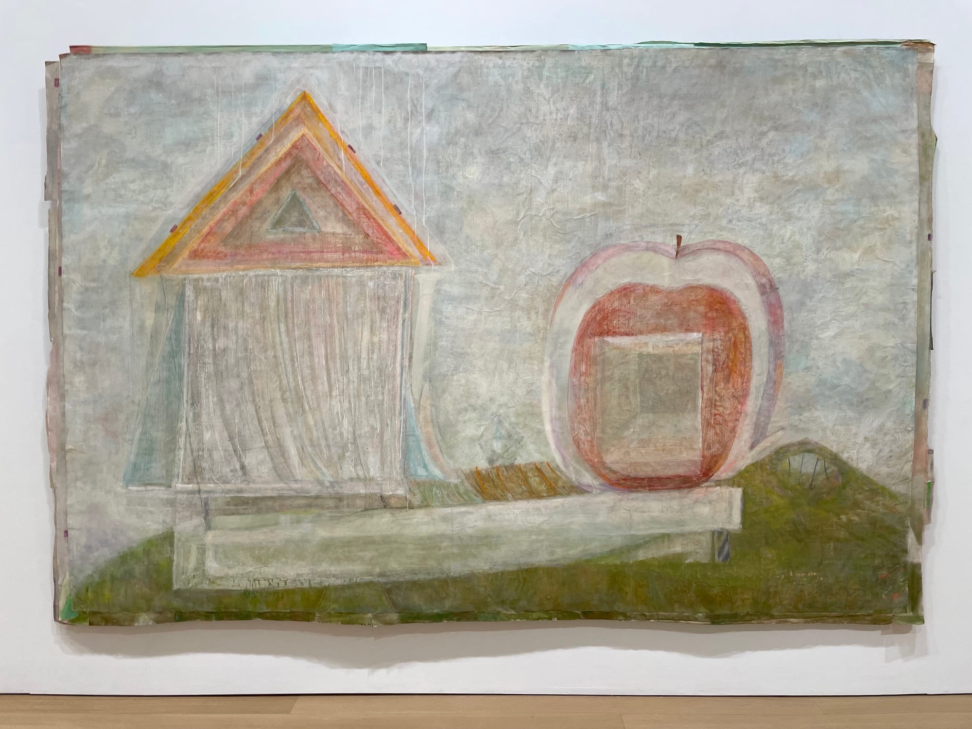 If Hiroshi Sugito’s deserted, dreamlike scenes seem to be suffused with drama, perhaps they actually are. The artist is an expert at transforming flat shapes and colors in an undefined pictorial space into what can seem like stage settings. In his latest exhibition at Mendes Wood DM, however, he diverges from the more overtly set like compositions of many past works. The most representational piece, “untitled (5)” (2025), balances a small house next to a giant apple on the edge of a horizon, like a storybook world, but the soft application of muted pigments makes them barely tangible. In contrast, the large, unframed “untitled (6)” (2025) is all atmosphere: a pale blue haze lined with forms that could be simplified trees or just lines and spheres suspended in the weightless realm of the picture plane. Either way, the show is strange and beautiful.