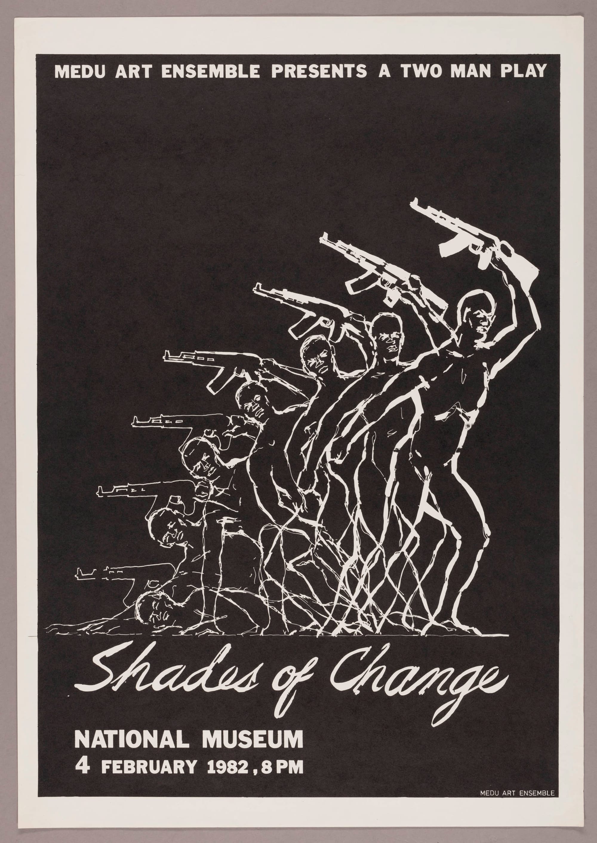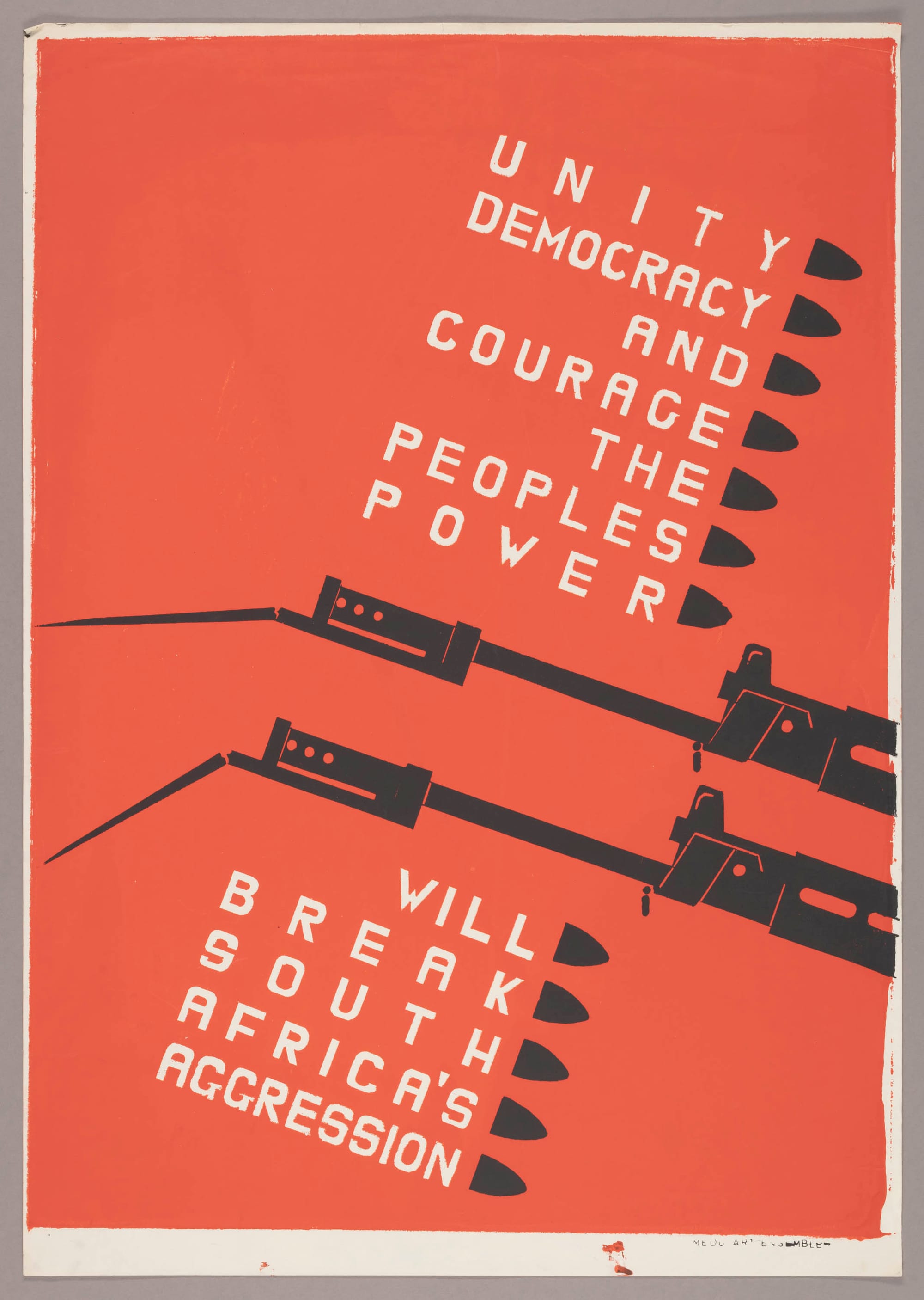 One of the main tenets of the Medu Art Ensemble was that their output should be functional, but in a sense that cultivated a deep sense of community and direction. Thami Mnyele, killed during the SADF Medu raid in Gaborone, said this (in the aforementioned film) of his own practice: “The act of creating art should compliment the act of creating shelter for my family or liberating the country for my people. This is culture.” Medu took advantage of the ban that barred all Black and colored artists from exhibiting in public gallery spaces in South Africa by making use of other means of art production; the group members also felt posters and pamphlets, which could be widely distributed, were the most accessible and empowering art forms at their disposal.