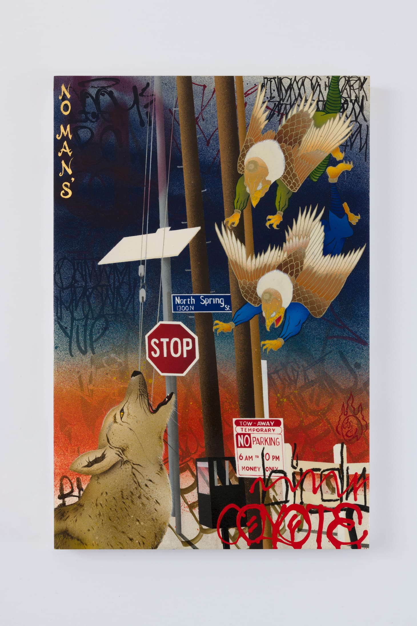 Last year, I made a bunch of smaller pieces; now I’m working on a large-scale painting. The latest painting I finished, “No Man’s LAnd,” references a specific place in LA located between Chinatown and Lincoln Heights, where artifacts and remains from the Tongva tribe were discovered. I’ve always been really fascinated by stories of the past, and it’s crazy to think of what LA was like, way back when.