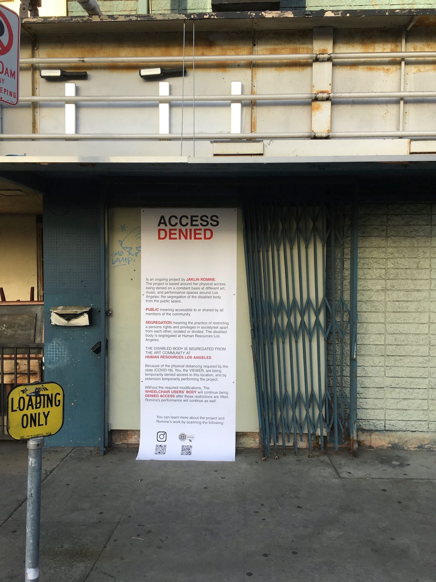 Romine’s latest project is a performance series, titled ACCESS DENIED, in which she travels to inaccessible art spaces in Los Angeles and documents her “body sitting outside for an entire art opening or closing.” Lately, during quarantine, she has created banners to hang outside most inaccessible art galleries around Los Angeles. Read more about Romine’s projects in the interview below.