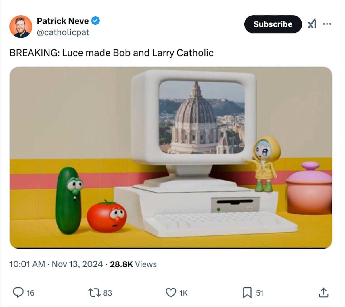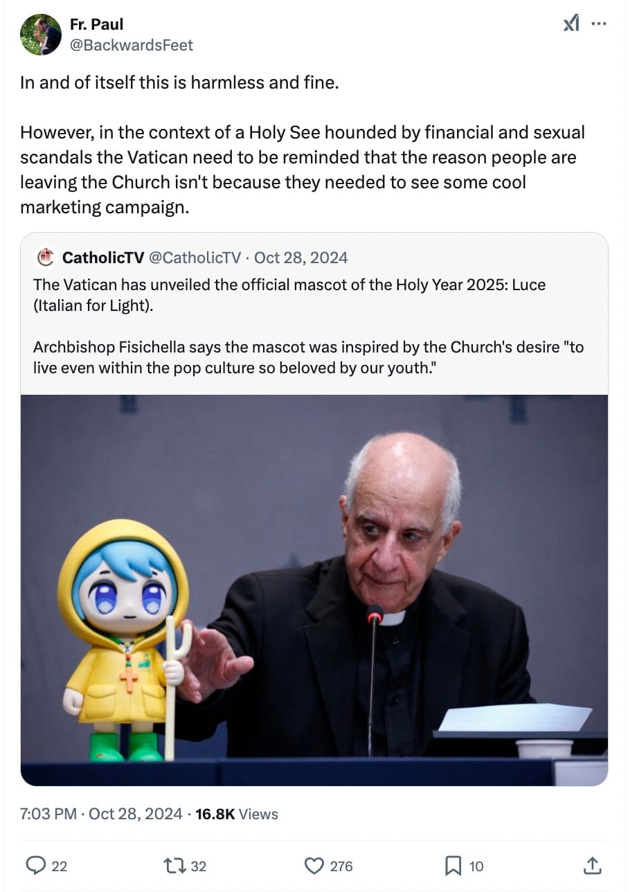 Some, like this user, posted about the mascot in the context of deeper issues in the Church, including child abuse and alleged fraud.