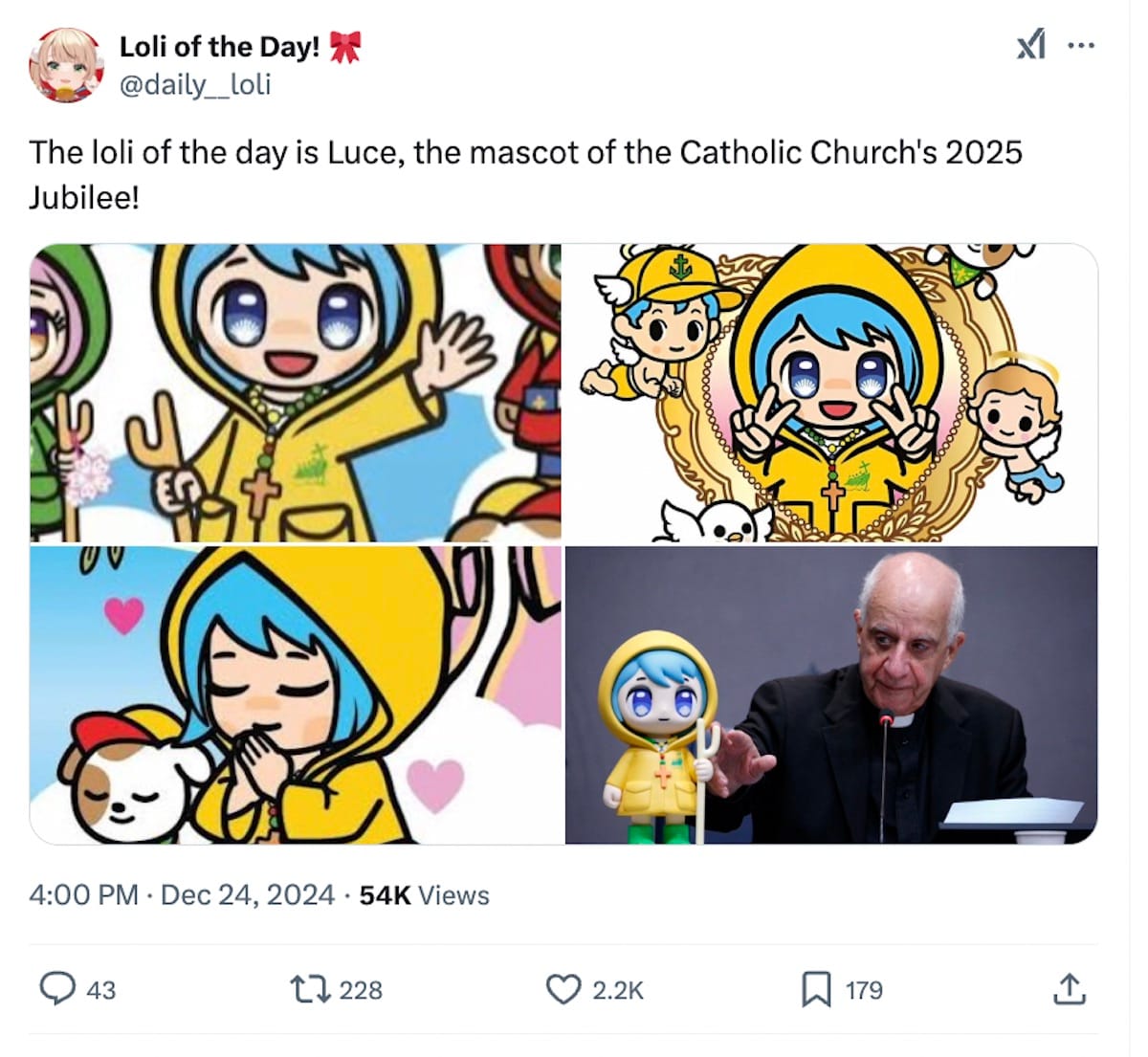 Archbishop Rino Fisichella revealed the mascot illustrated by Japenese-influenced Italian designer Simone Legno at a press conference, noting that the character was "created from the desire to enter into the world of pop culture, so beloved by our young people." The archbishop added that Luce represented a “happy union” between “Christian symbols and Japanese culture.” The Vatican plans to bring Luce to Italy’s Pavillion at the 2025 World Expo in Osaka, Japan.