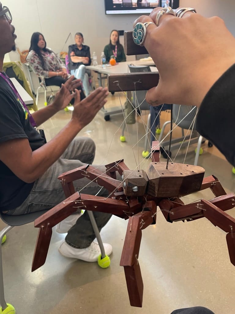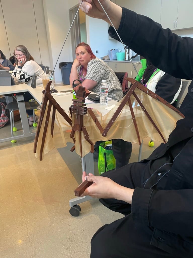 The Indian Arts and Crafts Act and the Native American Graves Protection and Repatriation Act of 1990 were passed to safeguard Indigenous communities and arts, but puppetry isn’t a craft listed in many of those legal protections. At the Institute, puppeteers shared strategies and stories of how they have and continue to navigate the art in and outside their communities under those circumstances. Local Oklahoma Osage puppeteers from the Wahzhazhe Puppet Theatre such as Candice Byrd-Boney, for instance, shared the experience of working with their tribe and community to develop community engagement with an Indigenous-centered and -led approach. For Byrd-Boney, “Puppetry is an expansive conduit and multisensory experience for everyone, not just kids.”