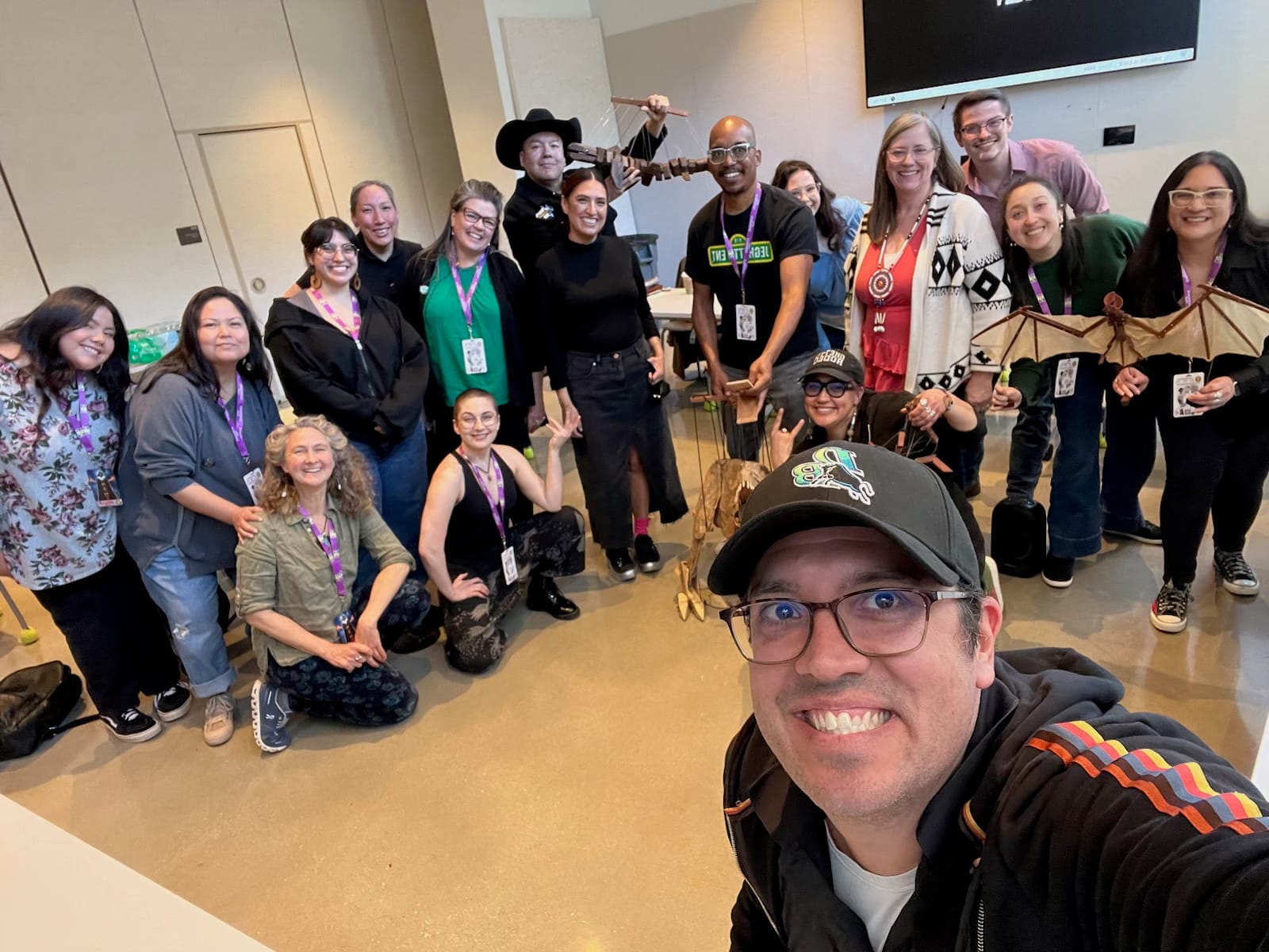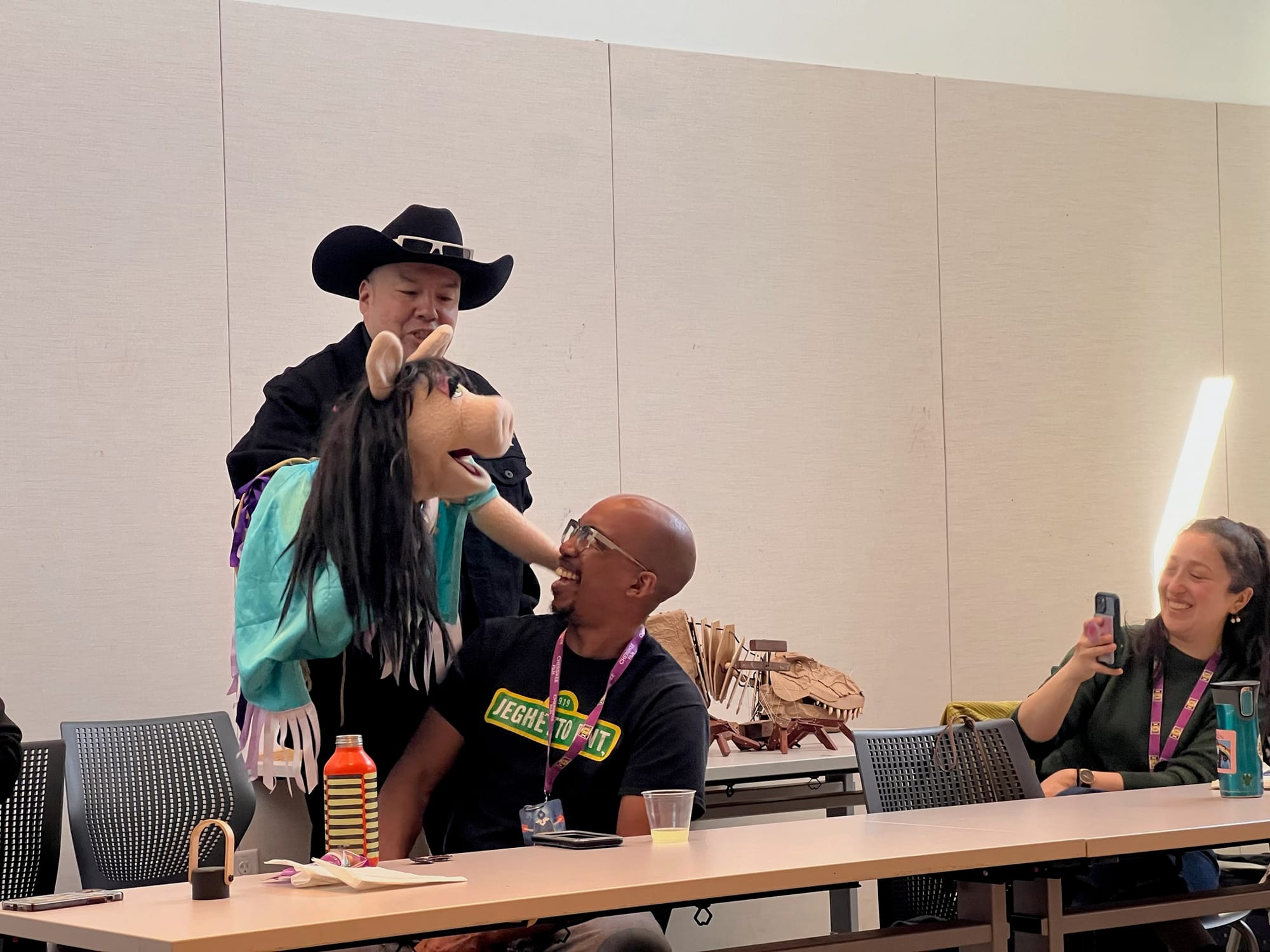 Some practitioners, such as DerRic Starlight, traveled across the country with a suitcase full of puppets (or, in his case, “Nuppets,” short for "part Native and part puppet”) to attend. When he was growing up on the Tsuut’ina First Nation Reserve near Calgary, Alberta, Starlight shared, it was his dream to get to Sesame Street and perform his own puppet shows for his classmates. On top of a career in professional wrestling, he still managed to maintain his practice and found his way to his current position puppeteering for the Apple+ relaunch series, Fraggle Rock (2022–ongoing). His blend of humor and vulnerability, as he shared his personal story of puppetry, had the circle of participants laughing and crying.