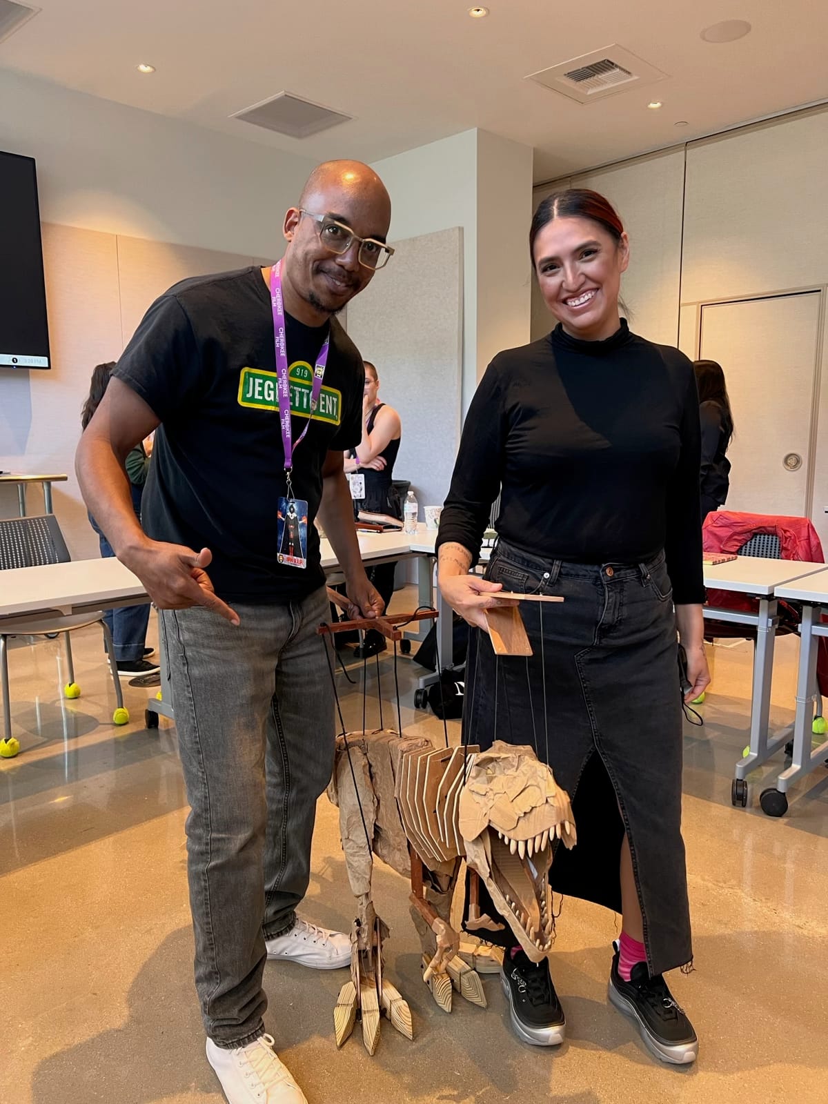 During the two-day Puppetry Institute this past spring, many Indigenous practitioners shared practices that ranged from marionette, shadow, and tabletop puppetry to theater, film, music videos, and street performances. There were formal workshops such as cosplay mask-making, as well as informal peer-to-peer sharing during meals. Workshops were often led by guest lecturers such as Tarish Pipkins, aka Jeghetto. A self-described “puppet engineer,” he showcased the complex and fluid movement of his creations, including pulleys and levers. Puppeteers gathered around his cardboard T-Rex marionette and took turns learning how to best maneuver it into performing natural gestures and walking.