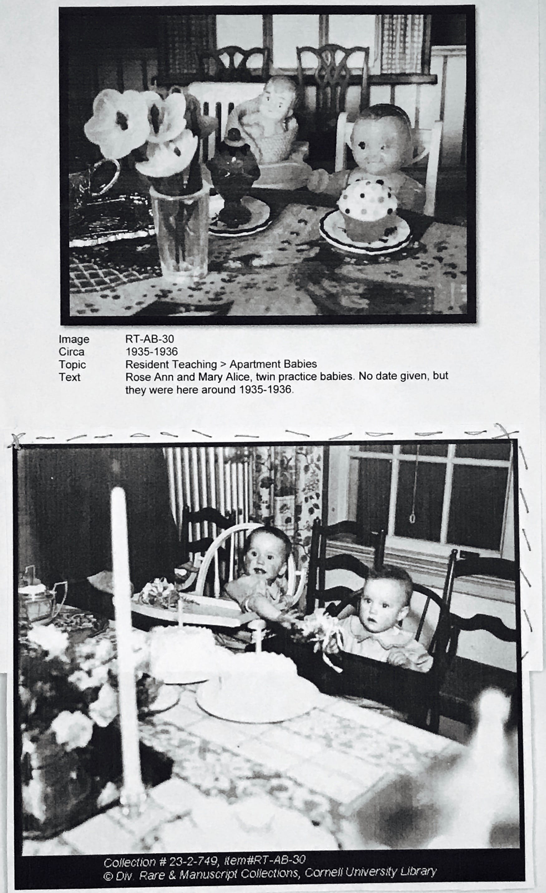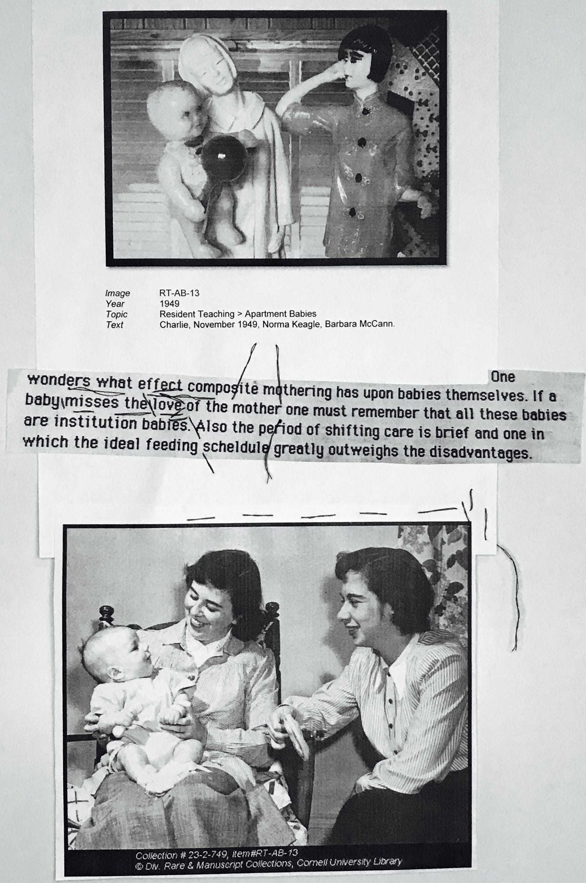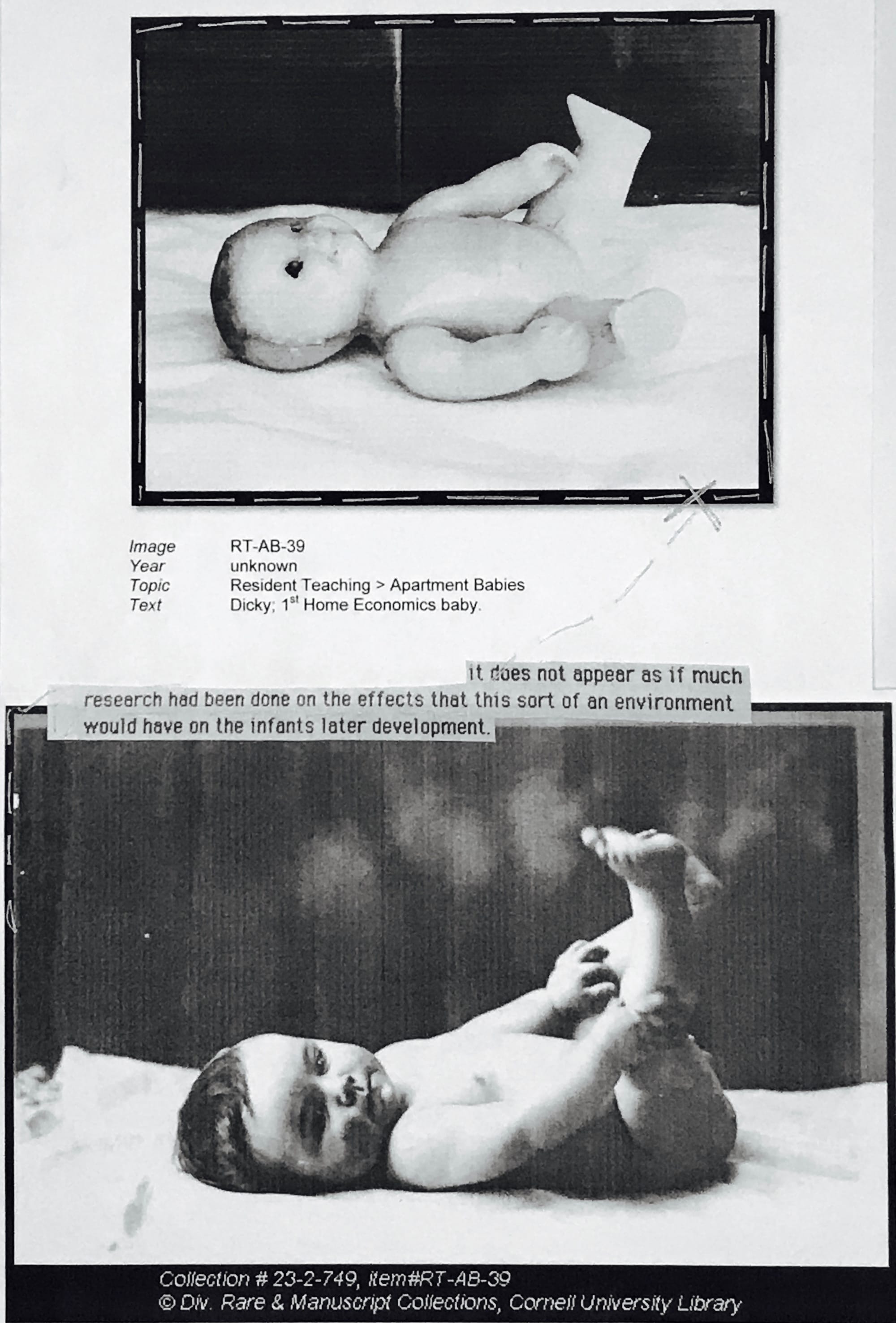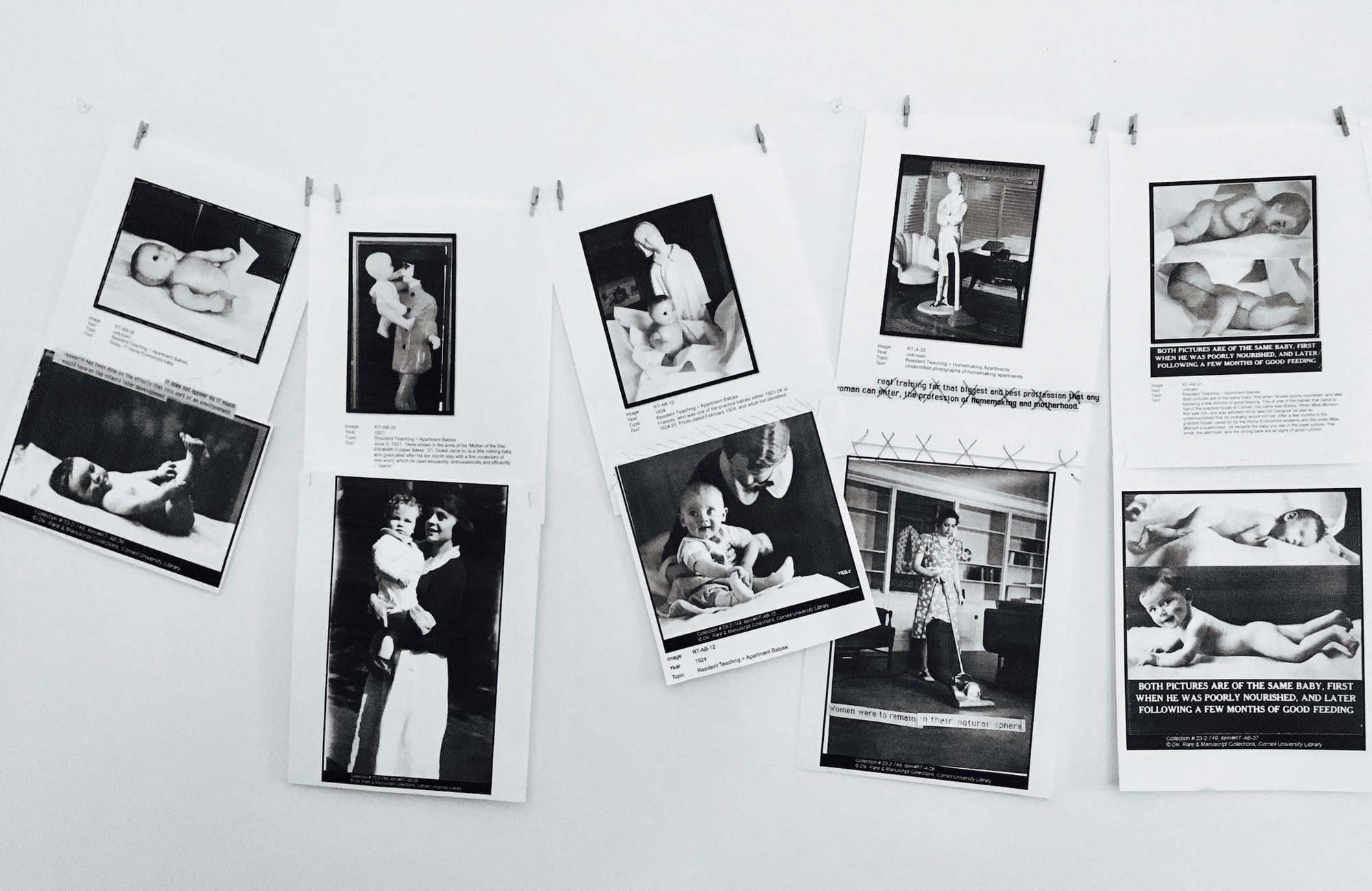 I spent days hunched over the table pawing through the material. It seemed the focus was on programmatic aspects of the then cutting-edge degree and its pioneering feminist leaders — Martha Van Rensselaer and Flora Rose — rather than on the babies, who seemed to have been treated like interchangeable laboratory specimens and less like tiny humans. All that remained of the 119 Domecon practice babies were a few dozen photographs. The black and white photos showed college coeds vacuuming, preparing baby bottles, diapering babies, and generally practicing at motherhood. In the photographs taken of the babies themselves some were chubby and exuberant, others emaciated and sickly. All of them were posed, propped up, and no doubt encouraged to smile. It seemed to me to be the commodification and idealization of what a “real child” should be: plump and happy: a confident blank slate.