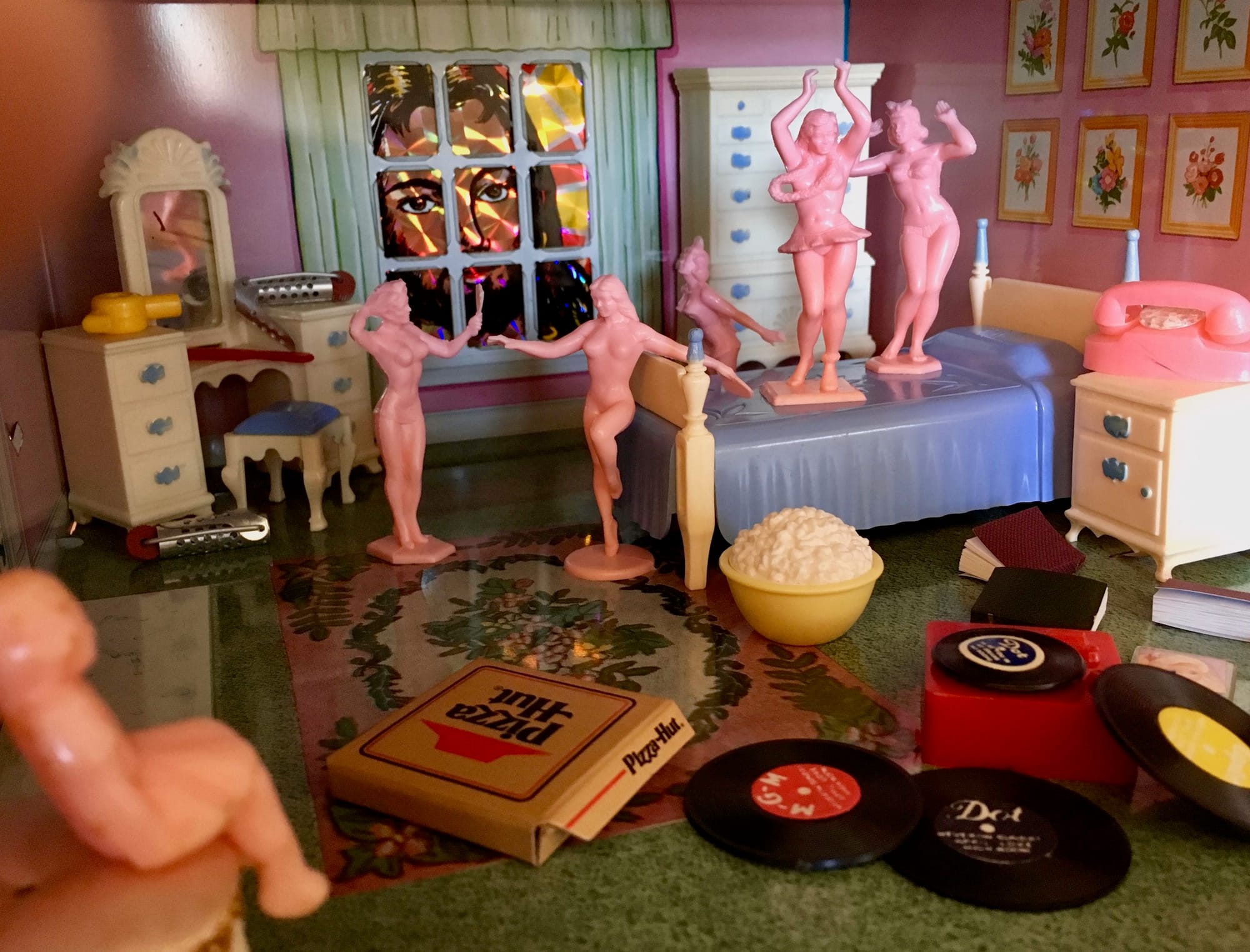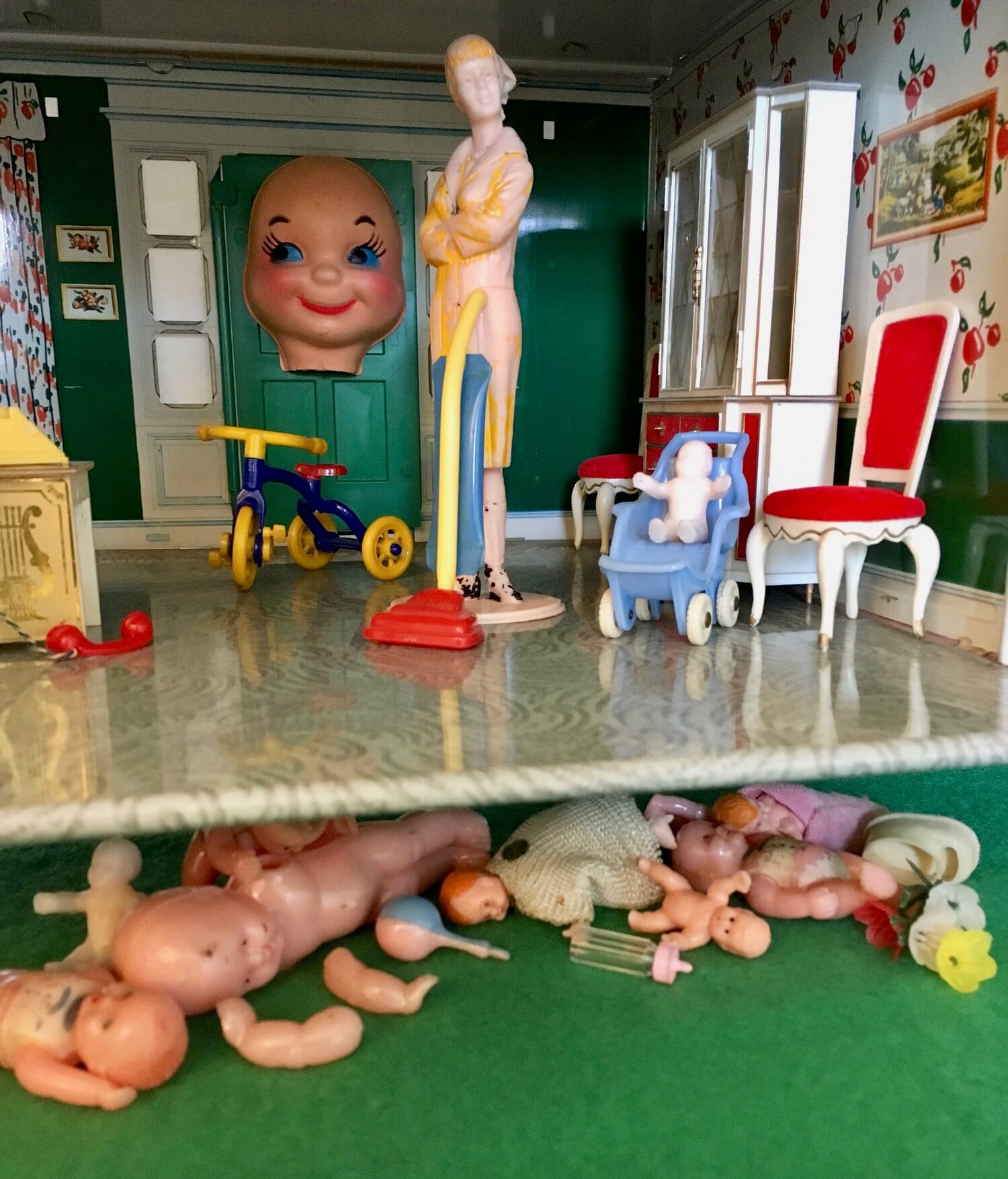 I took iPhone photos of as many photographs as I could and returned to my studio where I recreated the scenes in the ’60s-era dollhouse I’d brought with me. I’d found more of the fragile plastic baby dolls at a local junk shop that were similar to the two I’d brought with me and used them as stand-ins for the practice babies. A toy company called Renwal manufactured the dolls in the ’50s and ’60s. I could fit four of them in the palm of my hand.