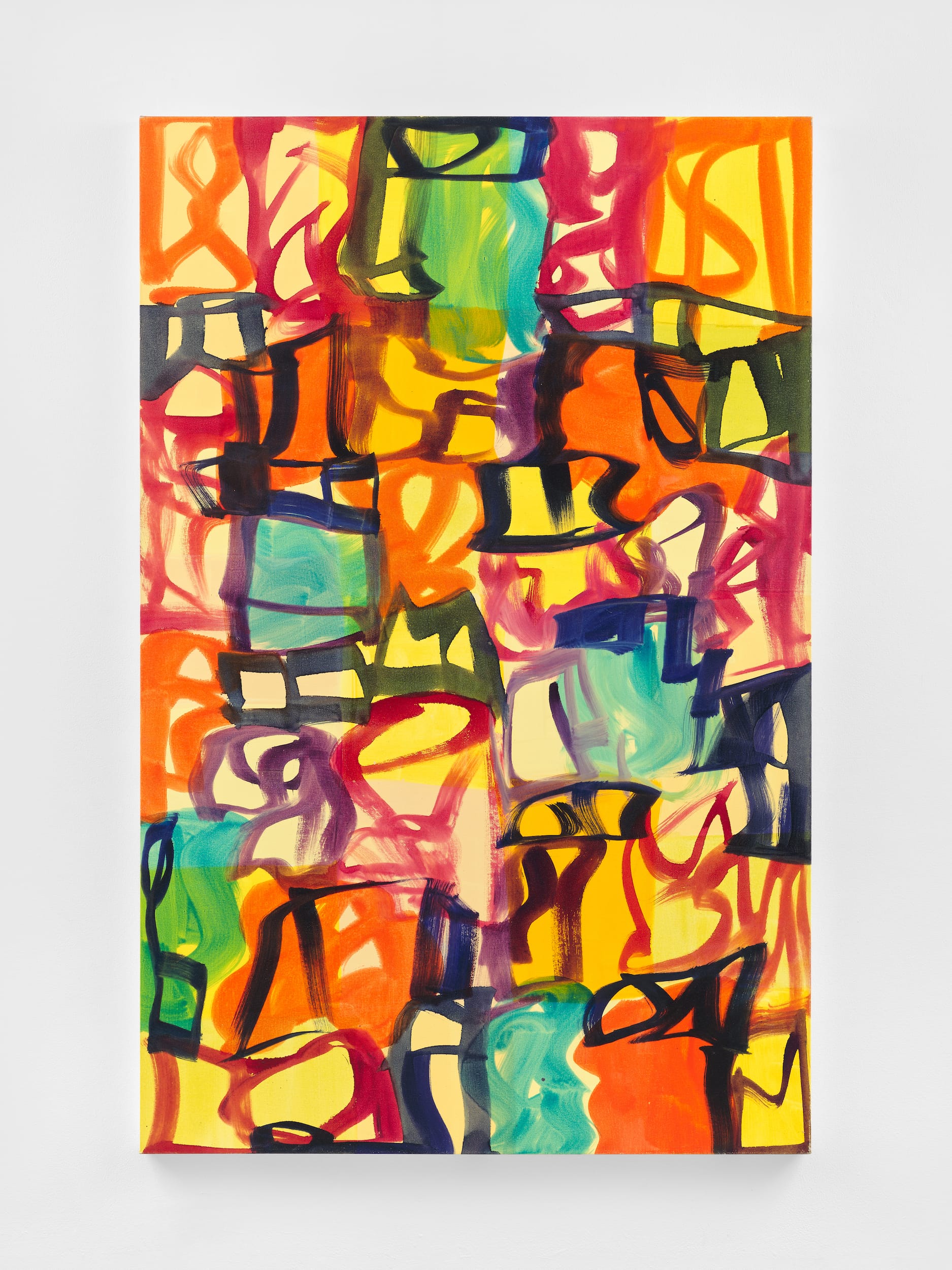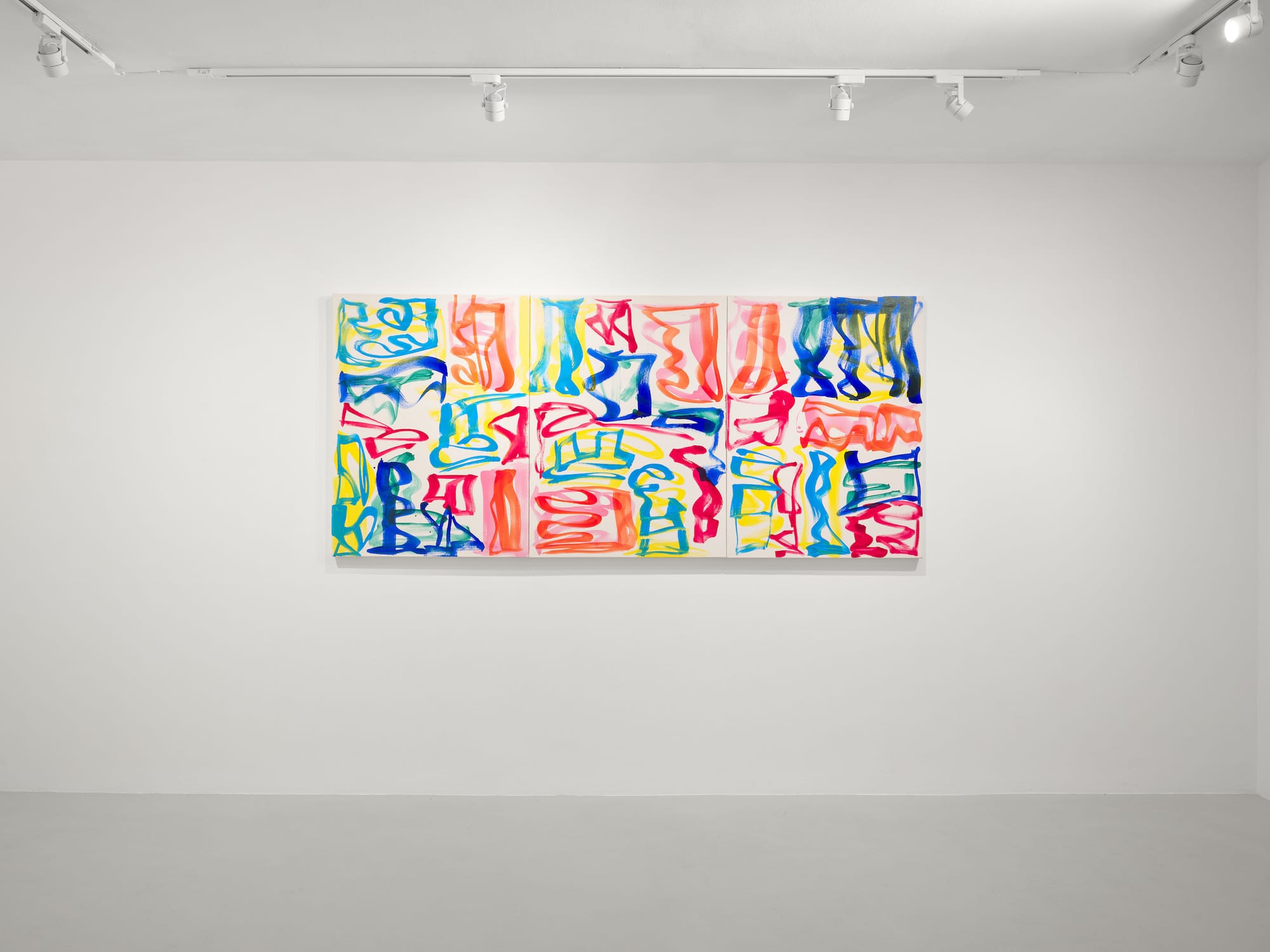 In contrast to her earlier paintings, with their dense brushstrokes, Meyer’s art of the past 20 years consists of thinly painted abstract glyphs. They are asemic signs, evoking both a language with no semantic meaning and indecipherable urban graffiti. The triptych “Springtime Trio” (2024) is composed of layers of glyphs on a white ground — first yellow, then blue and red, and finally a different intensity of red or blue placed over a similar color. The interrelationship between the layers — blue upon yellow and red upon red — does not feel programmatic.