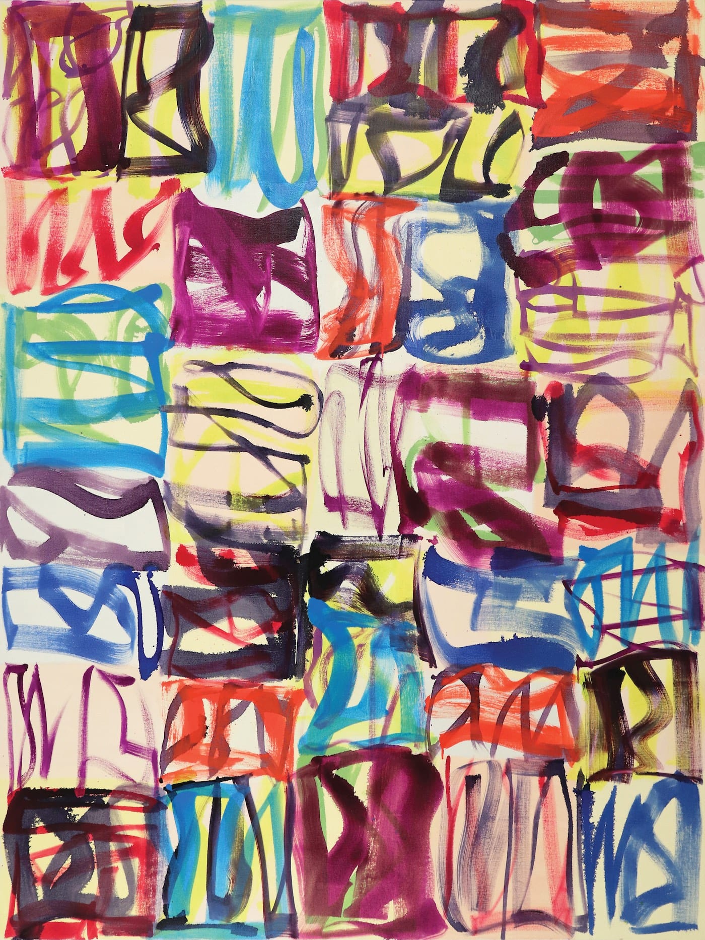 Meyer overlays this uneven ground with rows of tightly packed, open glyphs made with brushes of different widths. She often draws one linear, glyph-like structure over another, again following no pattern. The glyphs tend to be rectangular, with some aligned horizontally and others vertically. She might make one that is much like the one adjacent to it, except in a different color and with a thicker or thinner line.