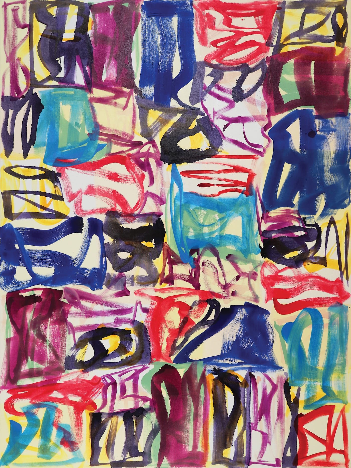 More importantly, “Trellis Too” and “Garden in Cassis” give you a lot to look at. The visual dissonance is jarring. You feel that each layer is clamoring for attention. There are the colors peeking through the two layers of drawing. There are glyphs jostling each other. The black line stitches the two layers together, but does not suppress their visual energy. I like the way the painting encourages my attention to drift across the surface as well as among the layers. Despite all the distinct glyphs and discernible layers, there is no focal point. You rest your attention at your own risk. Despite the painting’s pleasant title, there is something jarring, even distressing, about “Garden in Cassis.”