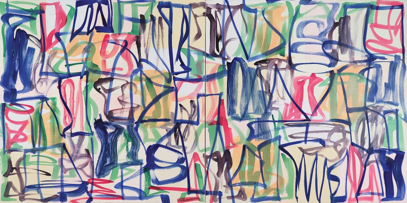 The exhibition consists of 13 paintings — many of them diptychs. There are two pairs of paintings, the diptychs, “Trellis Too” and “Garden in Cassis” (both 2017) and the vertical rectangles, “Summer in the City I” and “Summer in the City II” (both 2018), that I want to call attention to.