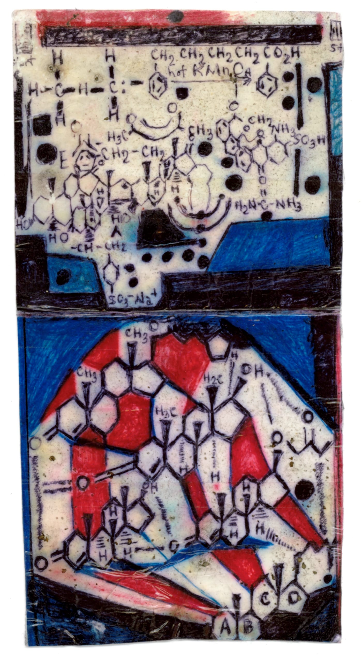 To listen attentively and absorb Way’s comments is to gain some clue to understanding — if “understanding” is even the right word — the messages and meanings of his art. Or maybe not. What might count more, perhaps, is its spirit — and precisely because, beyond what his drawings purport to represent, their meanings remain mysterious; formalists, in particular, may be hard pressed to extract some kind of cogent, recognizable sense out of Way’s colors and random patterns, even if their maker so obviously can. (At one point, Way pulled a tiny drawing out of his jacket’s inside pocket, where he stores his works-in-progress for months or even years, like protective talismans, as he routinely revises them, often covering them with clear tape, until he is ready to show them publicly. “This one here,” he said, holding up a small piece of paper covered with round shapes and symbols for hydrogen, oxygen, nitrogen, and the methyl and phenyl groups, “this one is all about the life force.”)