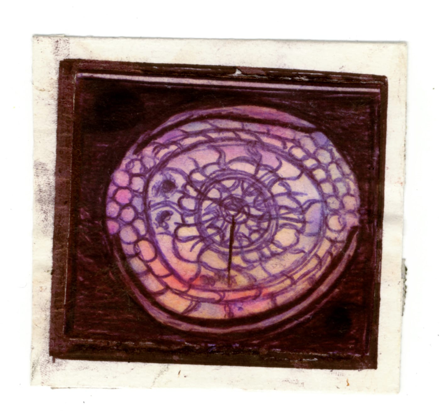 Works in the current exhibition include, among others, “CL23H” (1989). One of the earliest ballpoint-pen pieces among the first group of drawings Way showed Castrucci years ago, it depicts an expansive blob covered with a maze of chemical-compound structures whose taped and inky surface brings to mind the milky luster of ancient, blue-and-white porcelain. “Seaweed” (2013), despite its tiny size (three by three-and-a-half inches), feels monumental in scale; its purple-pink circular form, which is decorated with a kind of patterned web, resembles a shield, an eye, or perhaps an alien spacecraft.