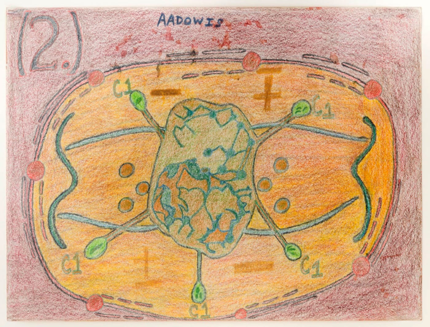 Way told me that, before the late 1980s, when he first showed Castrucci his drawings, he had studied books about medicine, including Physicians’ Desk Reference, the medical industry’s standard compendium of prescription drugs. Over the years, he explained, he had written music, served as the governor of South Carolina (where he created cocaine), and purchased the territory of Alaska. He said, “I became a little boy again when I was governor. My ego fell out, and I became Melvin Jakes and also Admiral Jones.” At one point, he noted, the head doctor for the US military’s Joint Chiefs of Staff had served as his personal physician. He spoke about reverting to the age of 16 even while remaining a man in his early 60s, and discussed the relative ease of time travel — that is, if one knows how to go about it. “I learned about it by reading the Encyclopedia Britannica,” he advised, adding that, when it comes to voyaging through the space-time continuum, the roles of certain subatomic particles are worth keeping in mind, including those of the neutron, the positron, and the “lipton” (as in “Lipton Tea”).