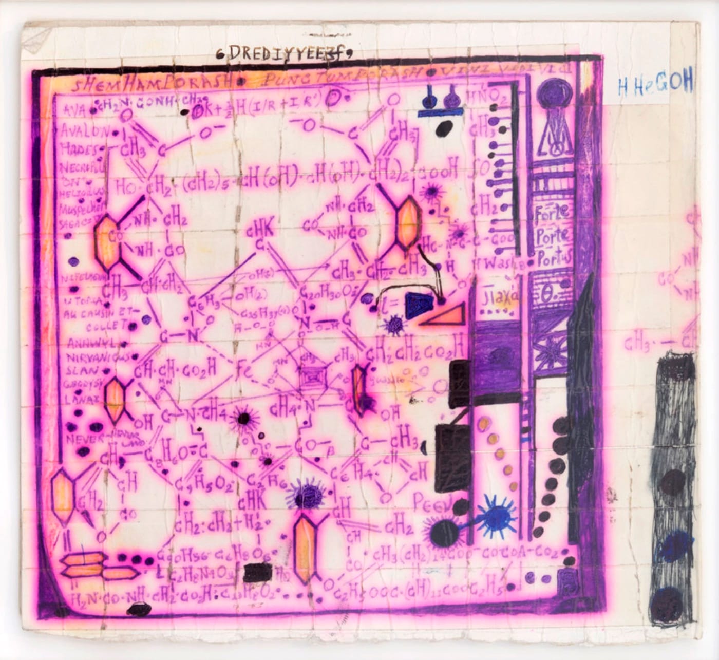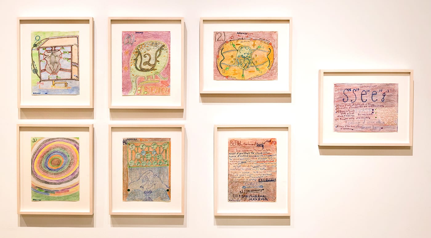 For all its air of mystery, there is nothing mystical about Way’s art, and it does both the artist and his work a disservice to romanticize one or the other — or both. To the contrary, to hear Way describe his research, outlook, and intentions is to grasp that he genuinely tries to bring a scientific approach to his art-making. In various ways, his work may be seen to share certain affinities with that of notable art brut, outsider, or self-taught image-makers whose art is similarly diagrammatic, or features real or imaginary mathematical elements.