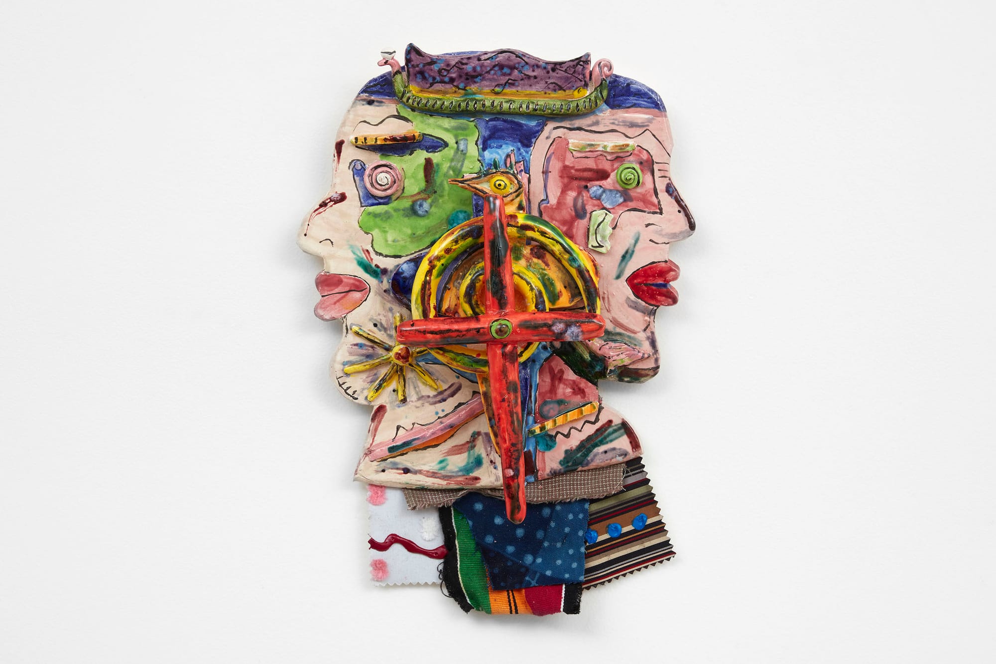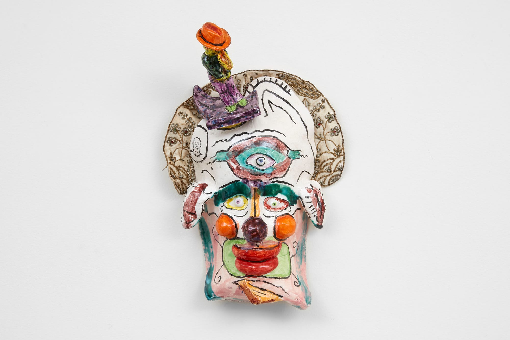 The exhibition Vino's Carnival of Ceramic Curiosities, or the Circuitous Path to Calamity (a name that Garretti credits Parker for) features more than two dozen ceramic masks and sculptures spread across two rooms at Parker Gallery. Garretti’s sculptures center largely on his reinterpretation of common carnival games and imagery, while his masks, he says, "imagine the superhuman alter ego.”