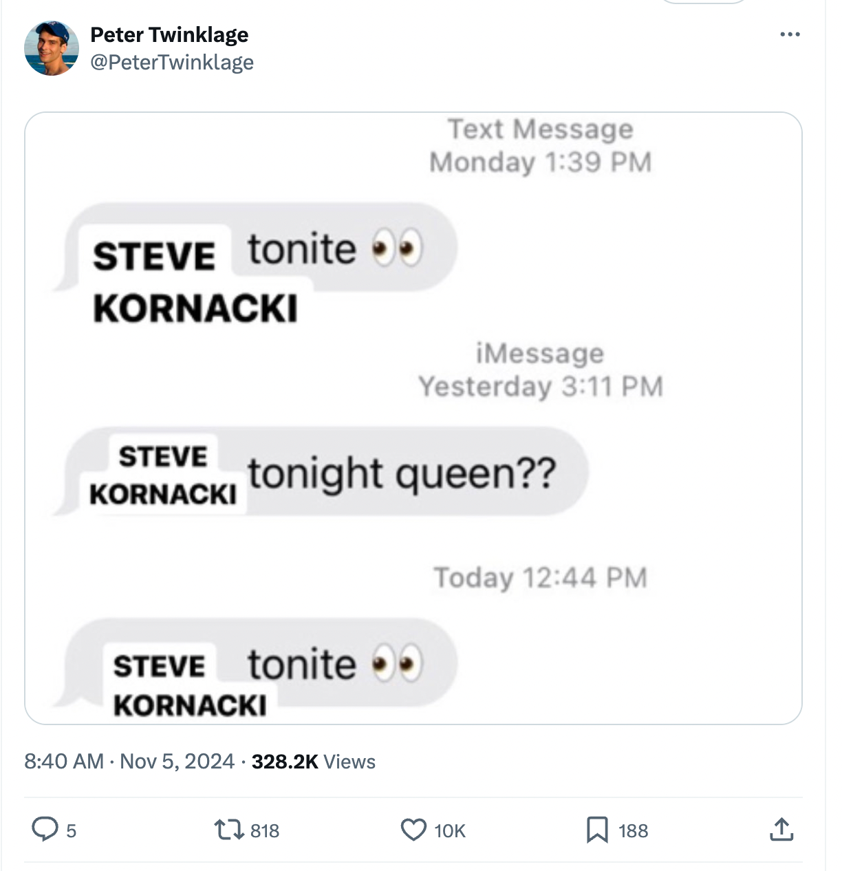 Memes from before the election embody a cult fandom for the election as a spectator event, much like tuning into a show like The Bachelor. One highlight from my selection of memes is a mock text exchange of MSNBC journalist Steve Kornacki (who by the way was featured in a live “Kornacki Cam” on YouTube during the election, at a camera angle only showing his backside).