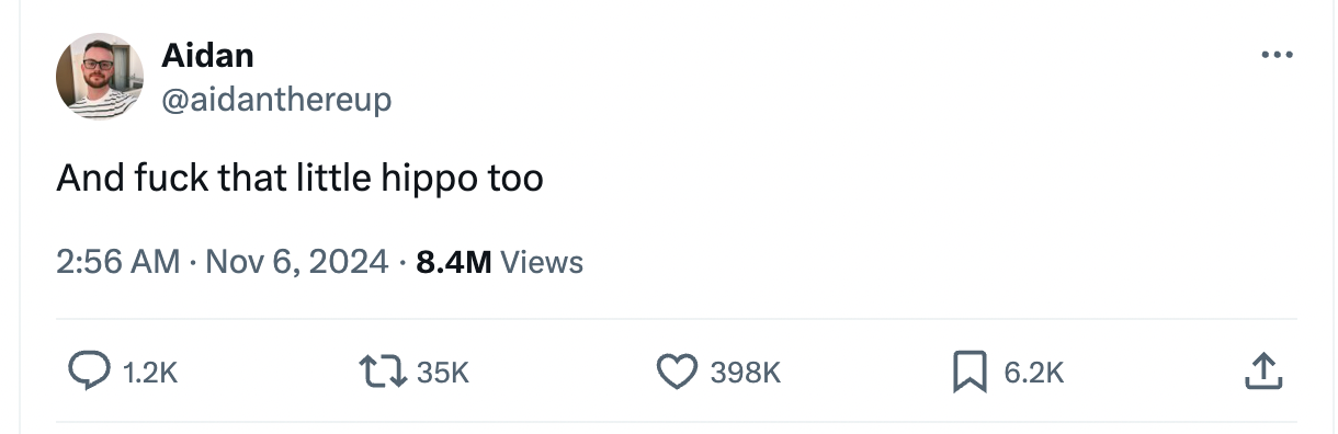 I hate to say it, but when I saw that lubricated hippo go for the Trump cake, I knew it was over. Months ago, I predicted the downfall of Moo Deng, and I’m pleased to say my hypothesis was largely correct: Many on X are now blaming her for the outcome of the United States presidential election.