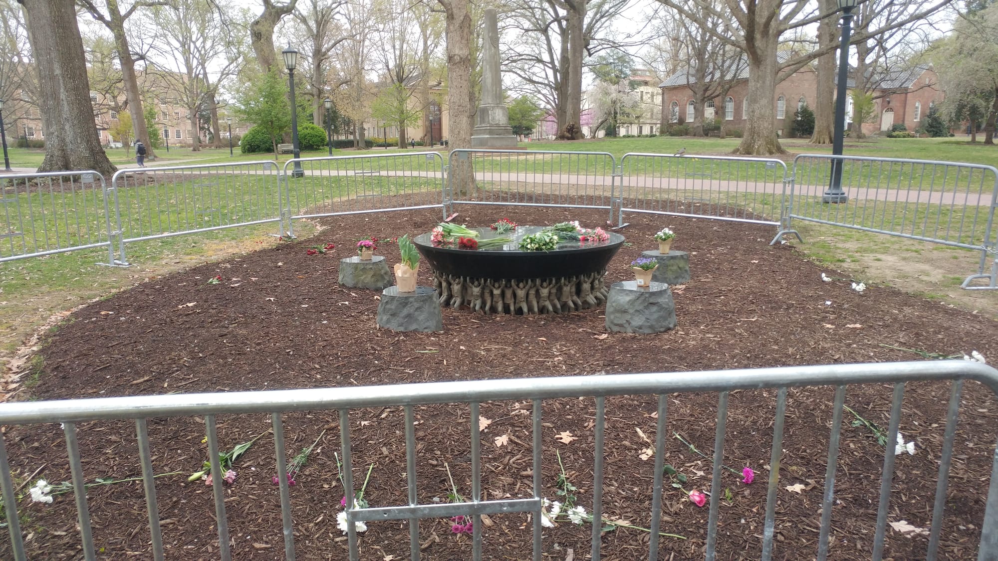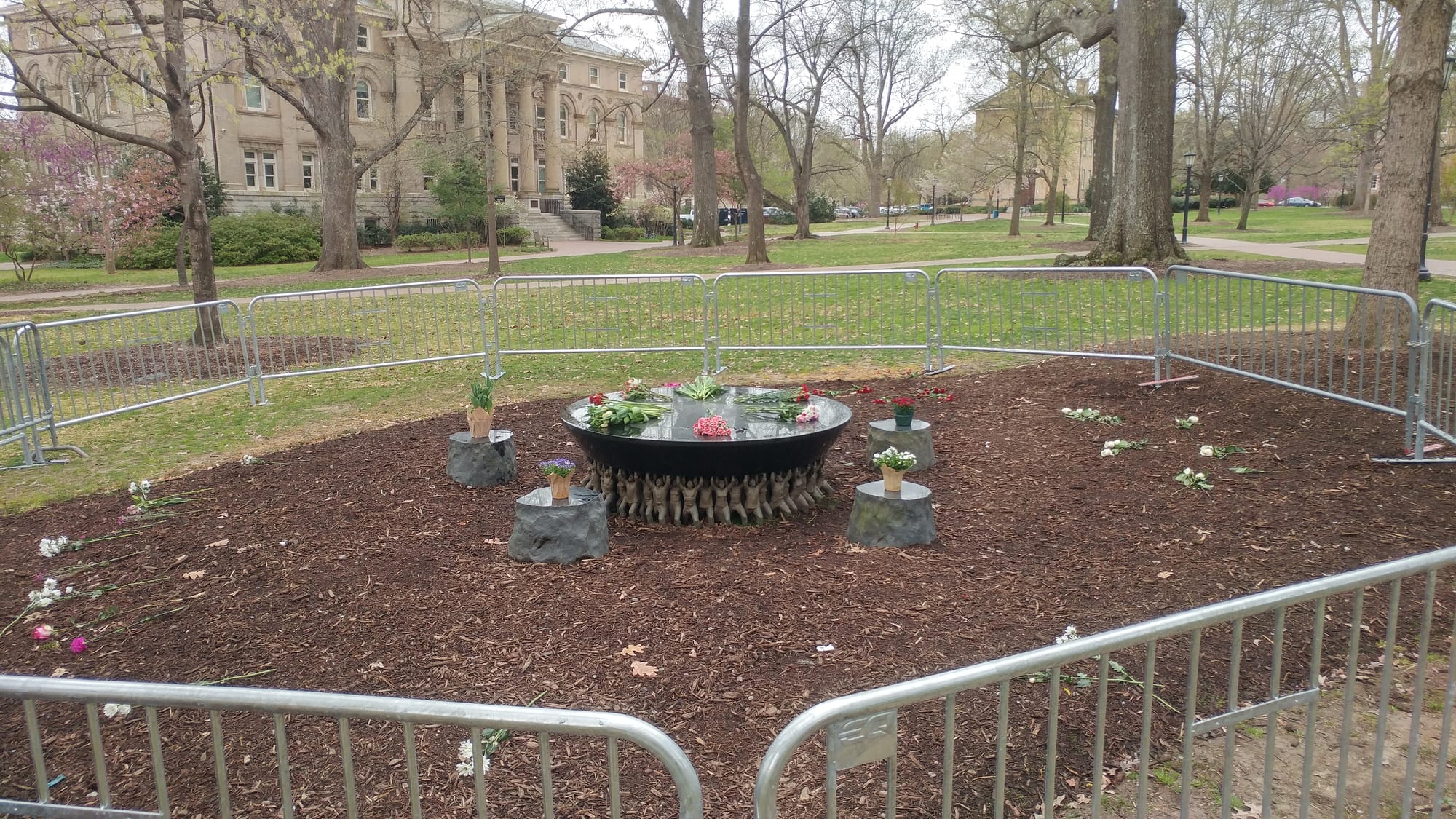 Bowles says that after Sunday’s vandalism, university police put barricades around the area, but this has not stopped students from placing flowers on and around the monument.