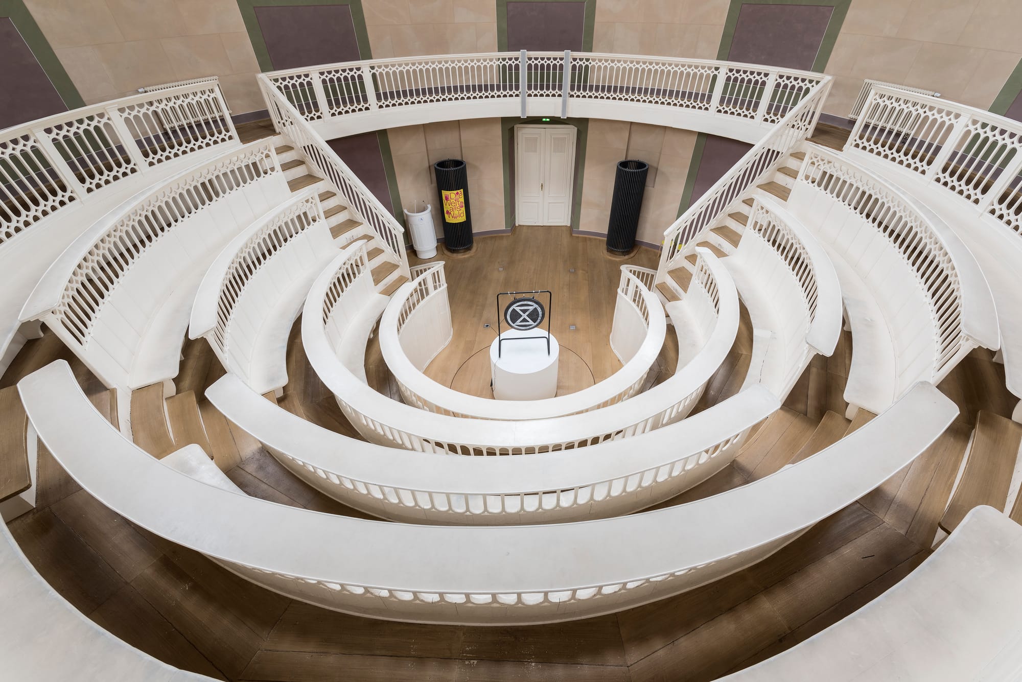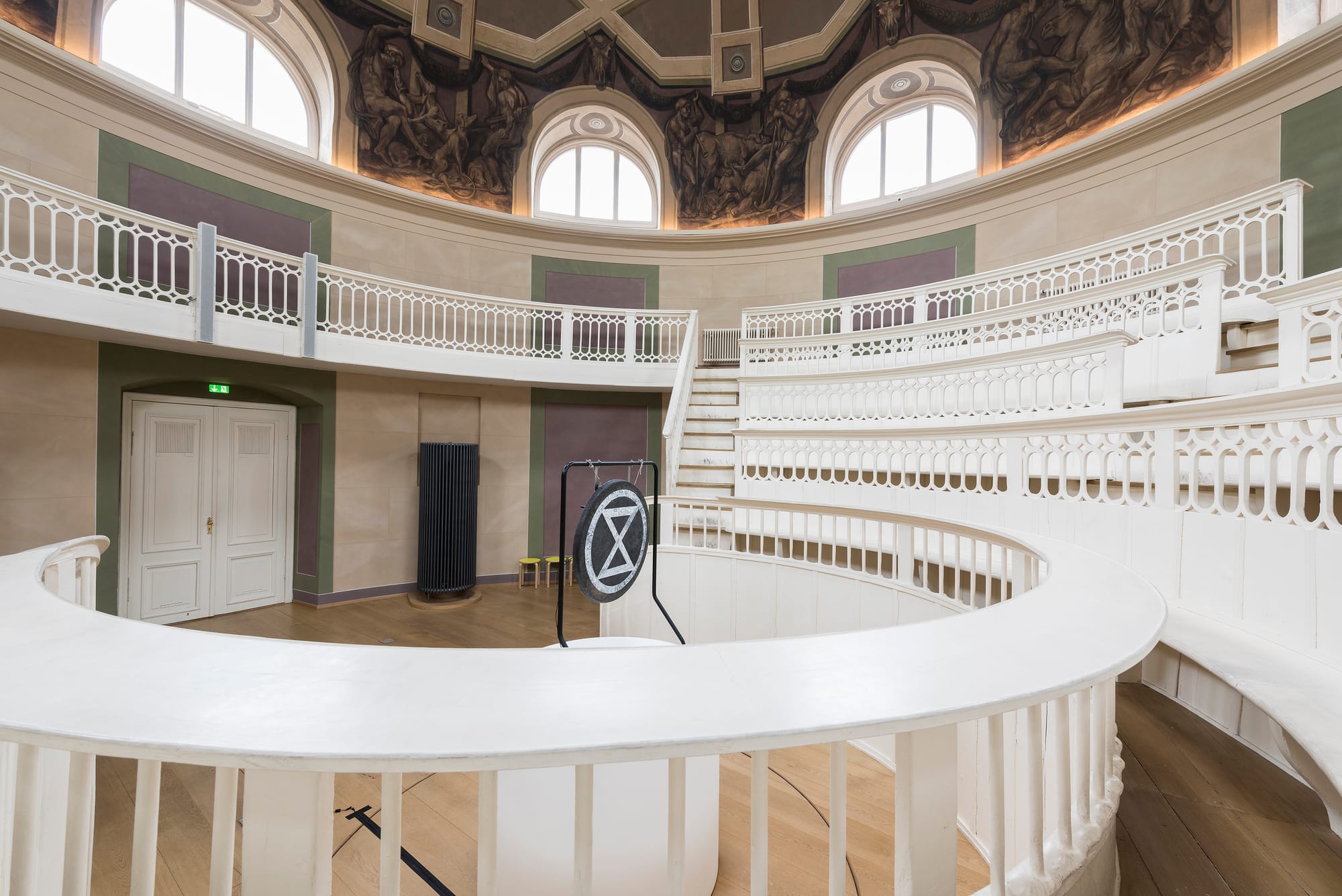 “Extinction Gong,” was commissioned for the three-part exhibition, Disappearing Legacies: The World as Forest, currently at the Tieranatomisches Theater, Humboldt-University, Berlin. The exhibition seeks to confront traditional understanding and representations of nature within the context of the sixth great extinction event. The show is curated by Anna-Sophie Springer and Dr. Etienne Turpin, both of whom have long investigated the social, cultural, and historical constructions of nature, about which I interviewed them three years ago for Hyperallergic.