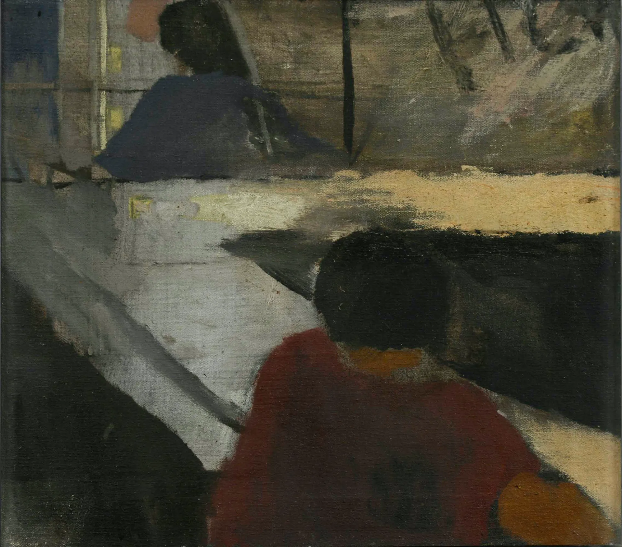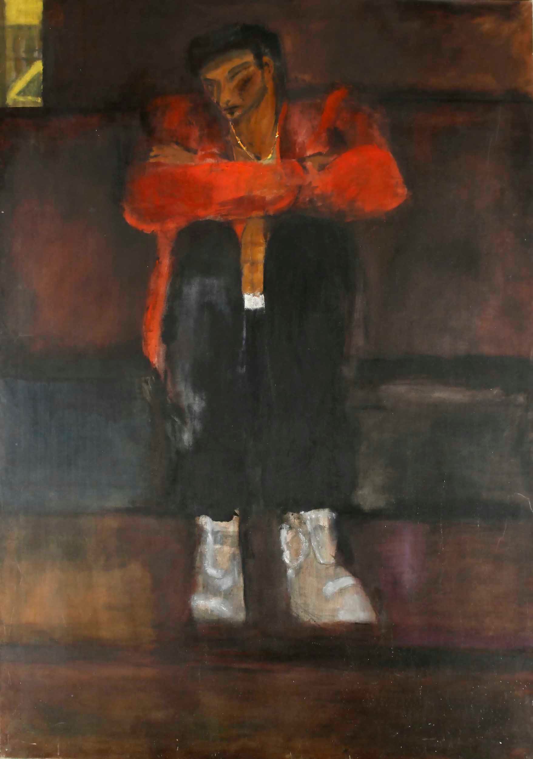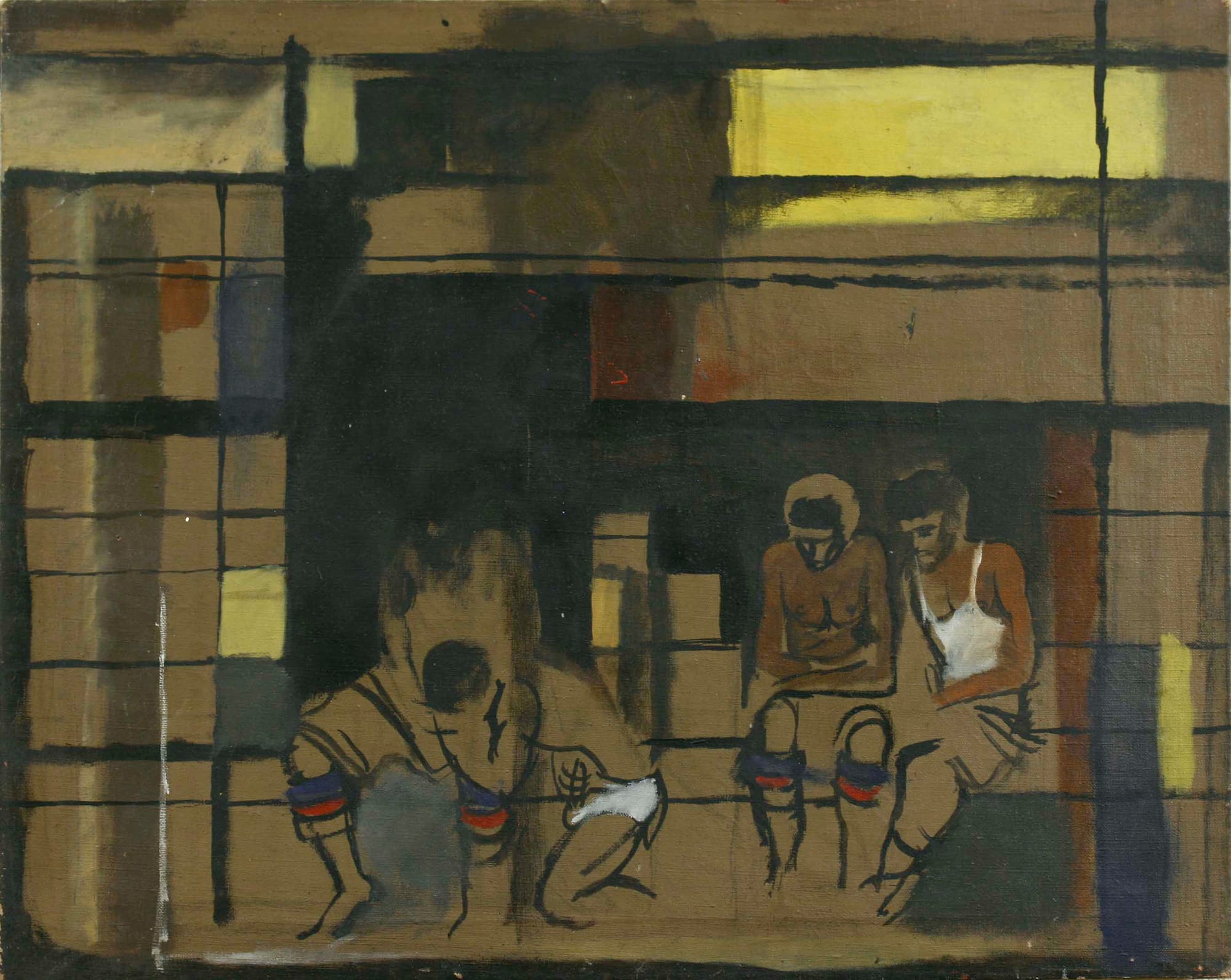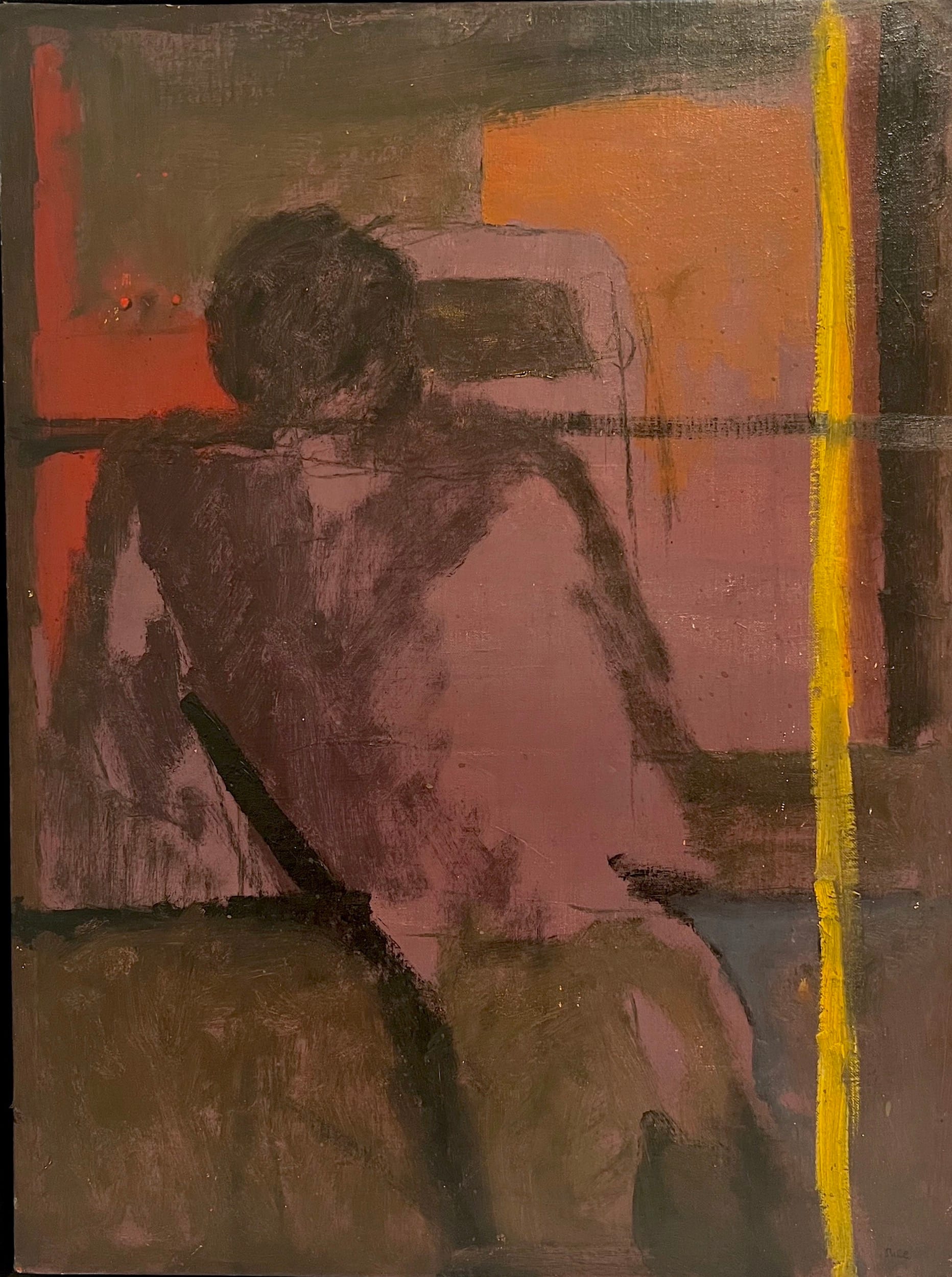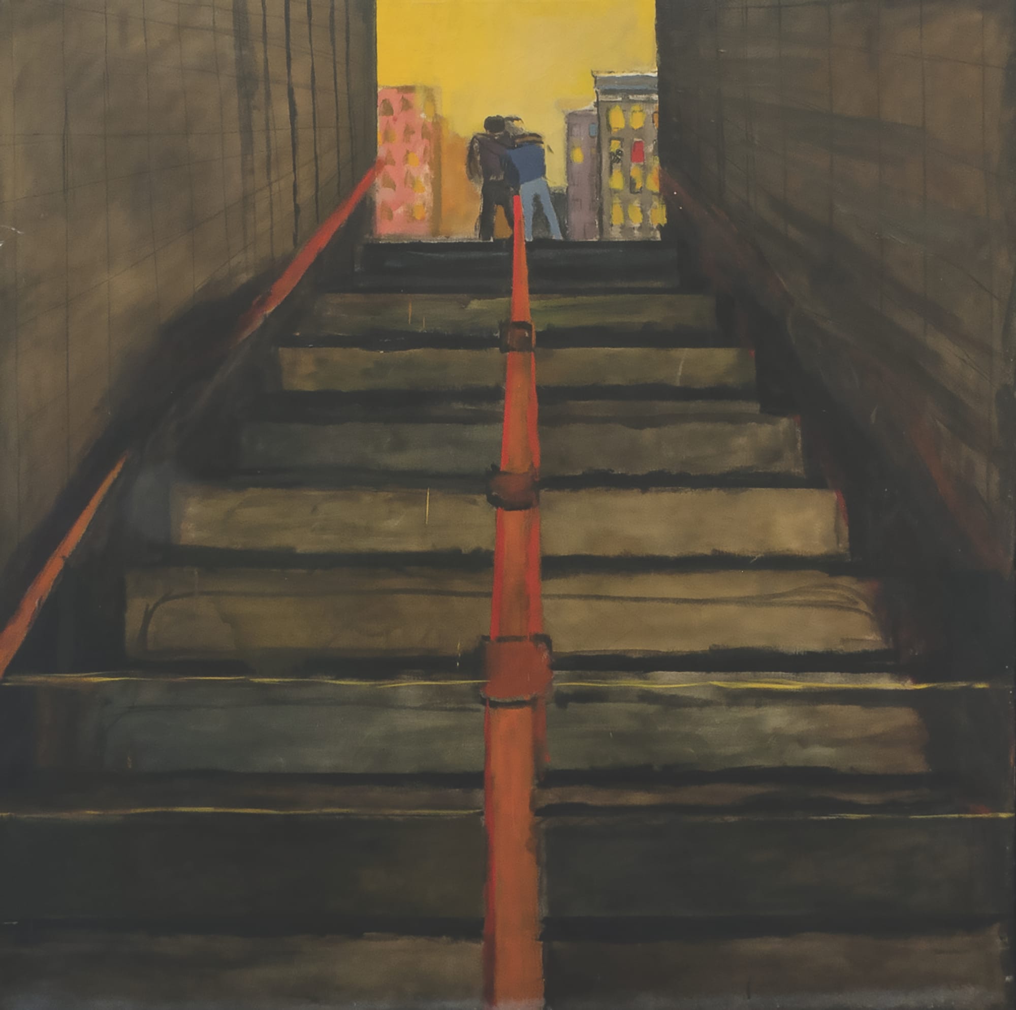 Bill Rice’s paintings, currently on view at Steven Harvey Fine Art Projects, are glimpses of East Village life — the old East Village of crime, abandonment, and cruising, of obscure figures with good muscle tone, surreptitious oral favors in the parks and alleys, stoop-front sales, and hanging out. His surfaces are slowly built up from thin layers of oil paint with an occasional putty-like vector or a colored stripe or, at times, a skeletal architecture or diamond-shaped fence pattern. Looking at his works we are moving constantly, roving, scanning the neighborhood where he had lived since 1953, when rent controls were still in place and you could get by on a few welfare checks and some decent luck.