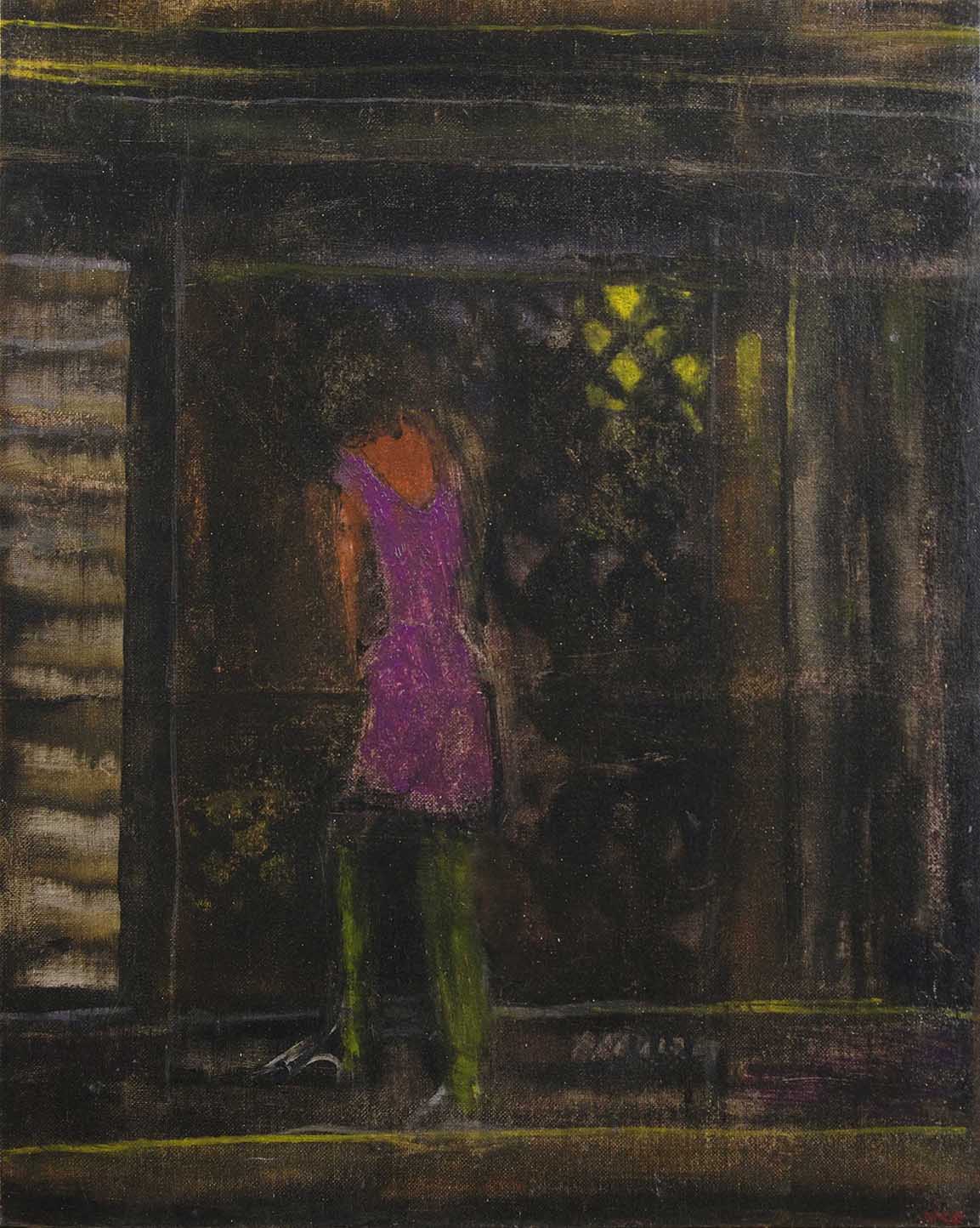New York has recently become the most expensive city on earth. Though street life here can feel like moving through an airport mall a lot of the time, the city is still grimy and grim deep in its overpriced bones. Carbon-colored dust languishes under the subway tracks, caked onto every upturned, neglected edge. There was a time when a soiled atmosphere was general across New York City; in Bill Rice’s paintings it seems almost a coauthor in his strange concoctions of dirty air and darkest night, shot through with flashes of color. The casually sinister streets and balconies hint at danger but are soon revealed as nostalgic records of his total enrapture with the denizens of the men’s detention shelter across from his crib on East 3rd Street and the surrounding empty lots, the humping cars and grunting trucks that pass though like strange beasts seen through the blinds of The Bar and, before that, The Old Hundred, where he always claimed the same seat for the evening, almost like a sentinel.