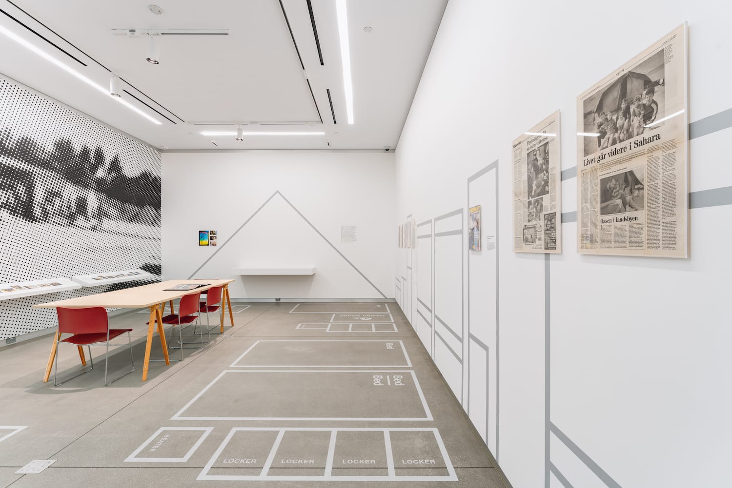 One of the museum’s galleries recreates the dimensions of the tent the Berbićs lived in with two other families. Gray lines mark out the exact placement of bunk beds, lockers, and a communal table. Berbić designed the room from memory. The walls are plastered with ephemera from their year in Sahara — newspaper articles detailing Ismet’s branding of the camp; drawings that Ismet created in his makeshift studio; and a Danish television interview with Hika and Ismet about being forced to leave Sarajevo and their new life in Sahara. Memory becomes embodied in this room, as Berbić attempts to sift through his own history of movement and change.