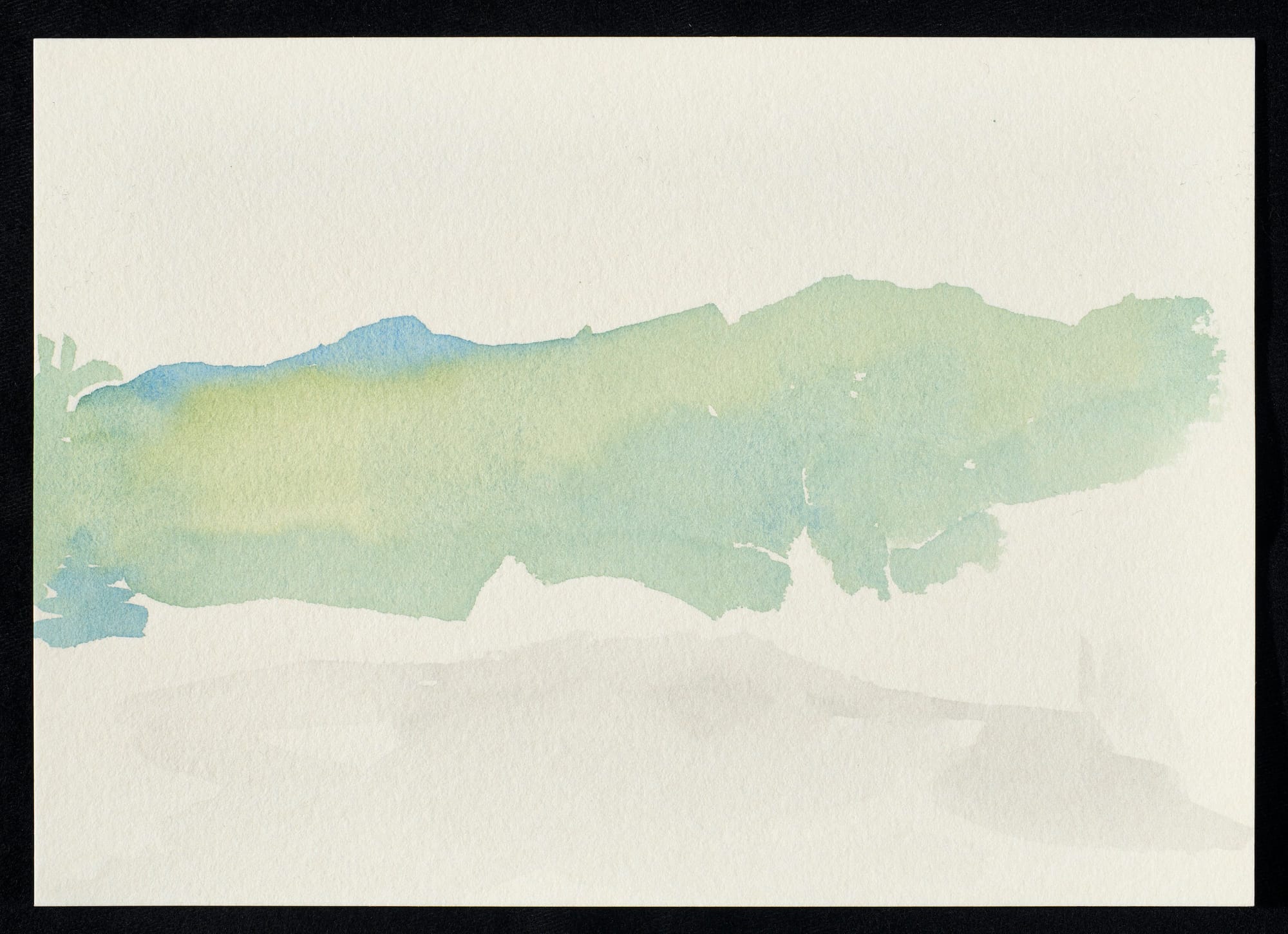 Vanderveen divides the horizontal format into three areas: lake, hills, and sky. The middle band is generally the darkest in color and the most defined in shape. The perspective shifts throughout, as the artist changes her position slightly or gazes in a different direction. She seems to have used only four pale colors in all the works: gray, blue, green, and yellow. The paper’s surface always peeks through. While she used a brush, the dried puddles or stains show no sign of her hand. Some of the works approach representation, while others only cohered as landscapes after I reminded myself of what I was looking at — and even then I was not always sure of what I was seeing. That slippage seems to me to be crucial to the paintings. Vanderveen is not trying to name something so much as depict — in these works at least — change and impermanence, the passing moment. If the watercolors are meant to be memory aids, a record of a day spent by a lake in Camden, they are also about a world disappearing from sight and the faultiness of memory. The modestly scaled watercolors hover between form and dissipation. I remembered the first stanza of Henry Vaughn’s poem “They Are All Gone into the World of Light”: