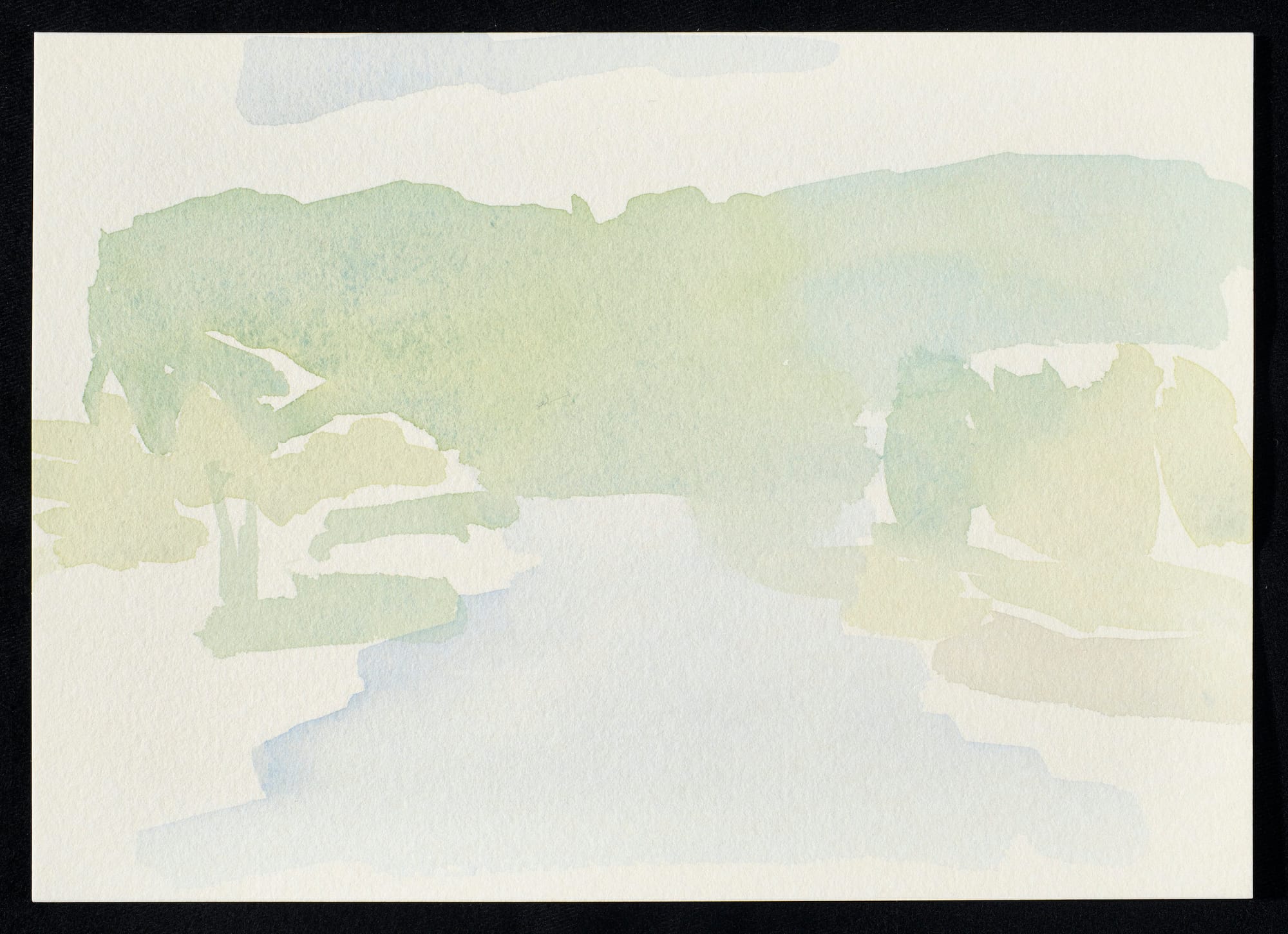 As soon as I saw the watercolors that Vanderveen had placed on the table before me in her studio, I wanted to write about them. The 15 watercolors, each measuring five by seven inches, were all made near a lake in Camden, Maine, over the course of a few hours in the summer of 2022; she started in the early morning and stopped in the mid-afternoon. They are a quietly joyous diary of light changing and time’s passage. At the same time, the sense of time passing and the aloofness of the material world introduce notes of loss and mourning into each view.