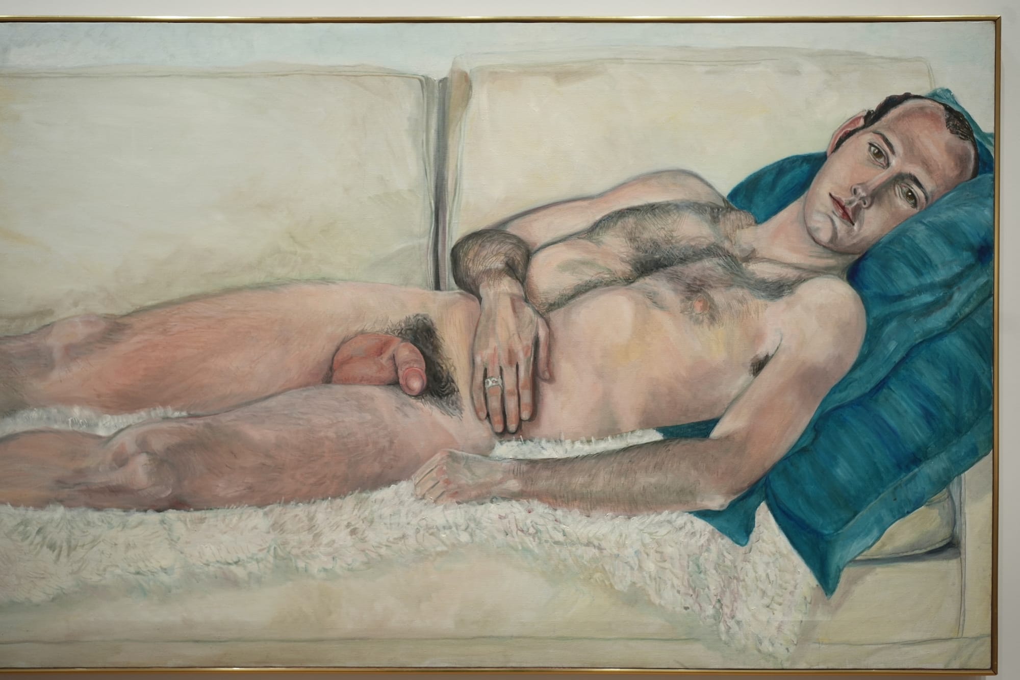 This small survey of the Welsh-American artist lingers on her best known portraits of men from the 1960s and ’70s, presenting us with images of attractive people, often with voluminous hair on their heads and bodies, who leisurely lounge for the viewer.
